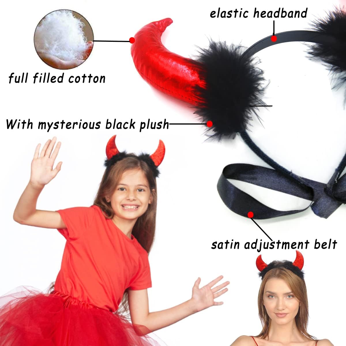 🎃【Halloween Devil Costume】Headband made of metal and ribbon, with red devil horns. The horns made of glitter material fill with sponge. Lightweight and comfortable to wear. This dress is so much fun, super cute and looks cool and mysterious.