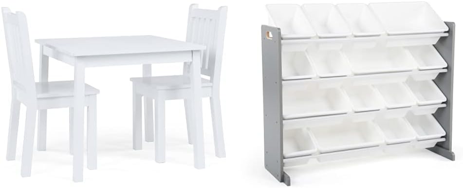 Humble Crew, White Kids Wood Square Table and 2 Chairs SetThe Tot Tutors Kids Wood Daylight Table and 2 Chairs Set is the perfect size for children to grow into. Kids can eat, read books, draw, color, do arts and crafts, play board games, do homework, and just have fun at this table. The table and chair set is ideal for your toddler’s bedroom, playroom, or the living room. This piece of furniture is easy to assemble and the sturdy table and chairs are great for boys and girls ages 4 years and up. Construction on this engineered wood table and chair set offers solid support and long-lasting durability. The height of this furniture is just right for toddlers and preschool-aged children to grow into. Giving your little one a table and chair set at their size gives them a sense of control and helps them learn independence. This kids table and chairs set comes in white to complement the existing furniture in your home as well as the toy storage organizer products in Tot Tutors’ line of kids furniture.Product sizing -Table: 24”W x 24”D x 23”HChairs: 12.5”W x 13”D x 26”HSeat height: 13”HTot Tutors offers a full line of children’s furniture, organizational basics, and storage solutions. We have multiple room collections that fit the style of any home. Our children’s table and chairs, toy storage organizers, toy boxes, bookcases, beds, and upholstered chairs blend with all of your home’s furniture. Whether it’s the living room, playroom, or your child’s bedroom, Tot Tutors has just the right product to help your family grow. Check out our other furniture by clicking the "by Tot Tutors” link under the product name.Humble Crew Supersized Wood Toy Storage Organizer, Extra Large, Grey/WhitePlaytime is more fun when your kids can easily take out their toys, books and games and then quickly clean up afterwards. The space-saving Humble Crew Super Sized Toy Storage Organizer with 16 Storage Bins stows your children's toys in easy-to-see, easy-to-access BPA and phthalate free plastic storage bins. Stylish colorways make it ideal for organizing your child’s nursery, bedroom, playroom, closet, even the living room....the options are endless! The 12 standard and 4 large storage containers are easy to remove, replace and reposition along the 4 tiered shelves—sized just right within the toy organizer for toddlers and preschool-aged children. It makes a great toy box storage alternative, helping keep your little one’s room clean and organized while at the same time teaching sorting and cognitive skills. Made with a sturdy engineered wood construction frame and steel shelving rods, each level can hold up to 20 pounds. Some assembly is required and all hardware is included. Product sizing - 42"W x 11"D (16"D with stabilizing braces) x 32" H Standard bin sizing: 12" L x 9"W x 6" H Large bin sizing: 16"L x 12"W x 6"H Additional plastic storage toy bins are sold separately.