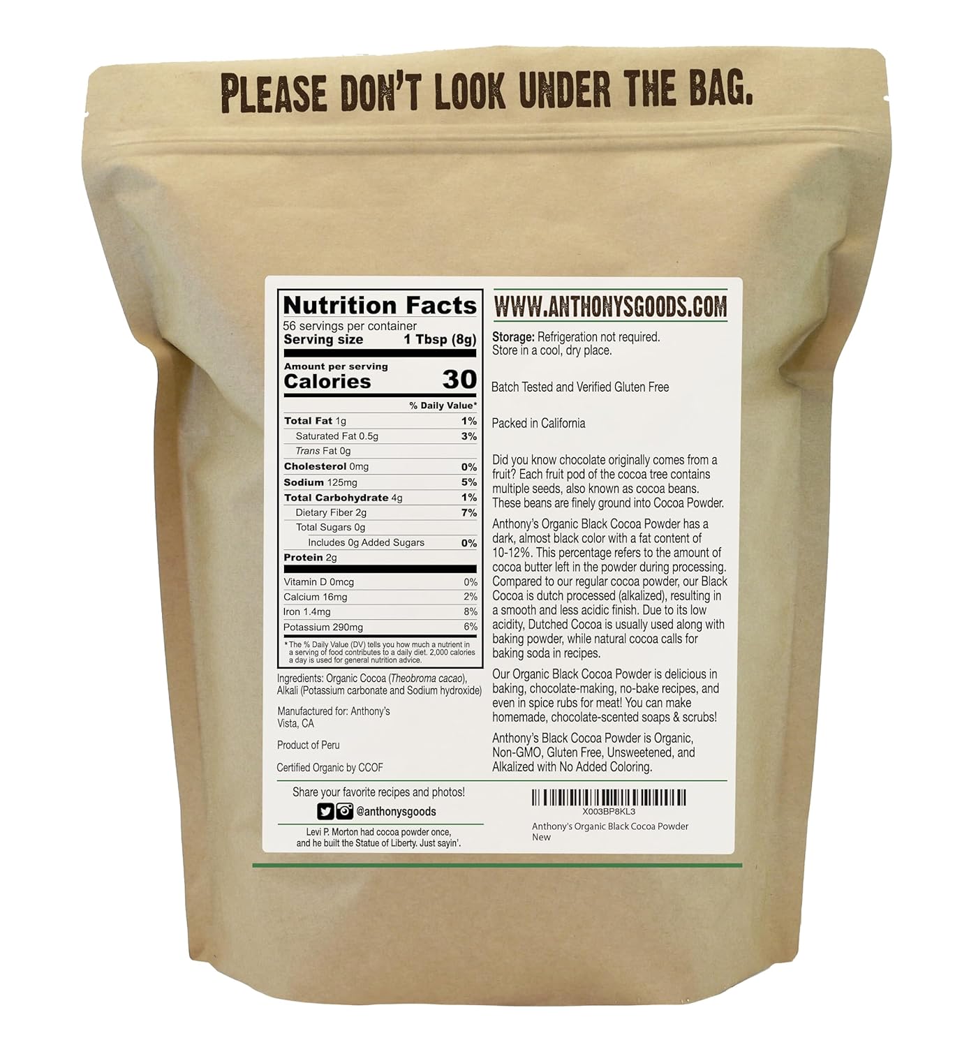 Cacao negro en polvo orgánico de Anthony, 1 libra, sin azúcar, procesado en Holanda, sin gluten, sin OGM