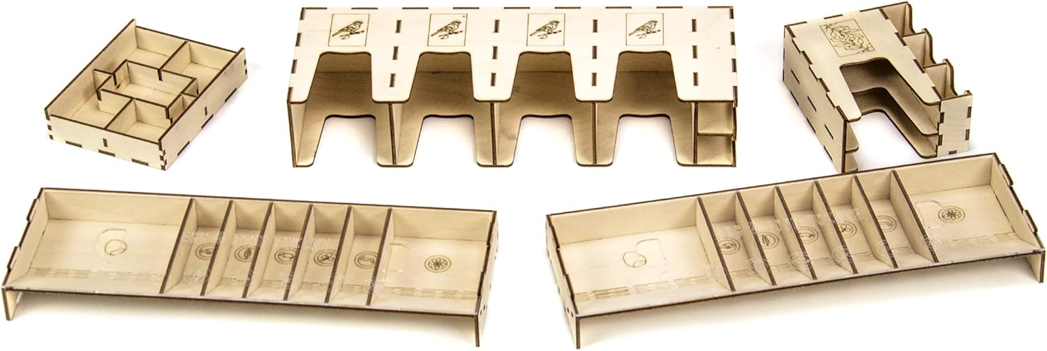 El organizador de alas es la solución perfecta para almacenar convenientemente los componentes de Wingspan y sus expansiones en la caja original. El organizador se ajusta a: Juego base de Wingspan; Wingspan: expansión europea; Wingspan: expansión de Oceanía; (solo un juego de tableros de jugador encaja en la caja). Reemplazo del cubiletero de dados. Cubiletero Chickadee de Gaming Trunk. Reemplazo de marcadores de acción por Gaming Trunk. Marcadores de acción de casa de pájaro 3D impresos disponibles aquí. Incluye 5 bandejas: La bandeja para cartas almacena cartas de pájaro y dos juegos de dados personalizados. Dos bandejas de fichas aseguran que los jugadores de ambos lados de la mesa puedan alcanzar fácilmente las fichas de comida y huevo. El fondo curvo de la bandeja ayuda a sacar las fichas de la bandeja. Una tapa de plástico transparente mantiene las fichas en su lugar durante el transporte y almacenamiento. La bandeja de cartas de bonificación encaja en cartas de bonificación, cartas de Automa y las fichas de objetivo. Los marcadores de acción se almacenan en la bandeja de marcadores de acción. Características del producto: Soporta cartas enfundadas hasta 61x100 mm@100 mkm La tapa de la caja se cierra perfectamente 5 Bandejas removibles: 1 Soporte para cartas, 2 Bandejas de fichas, 1 Bandeja de cartas de bonificación, 1 Bandeja de marcadores de acción Instalación y desinstalación rápida Hecho de contrachapado de abedul de alta calidad de 1/8" El peso del organizador es de 600 g (1,32 libras) Dimensiones 283 mm x 283 mm x 72 mm (11 1/8" x 11 1/8" x 2 13/16") El inserto se entrega como un kit fácil de montar. El montaje del inserto requiere aproximadamente 60 minutos. El inserto está diseñado para que las piezas encajen en su lugar, pero debido a las variaciones en la madera, puede ser necesario usar pegamento para asegurar las piezas juntas. Recomendamos pegamento para madera u otro pegamento rápido y pegajoso comparable. Algunas conexiones pueden requerir la aplicación de una fuerza razonable para ensamblar o recomendamos el uso de un martillo de goma (hobby).