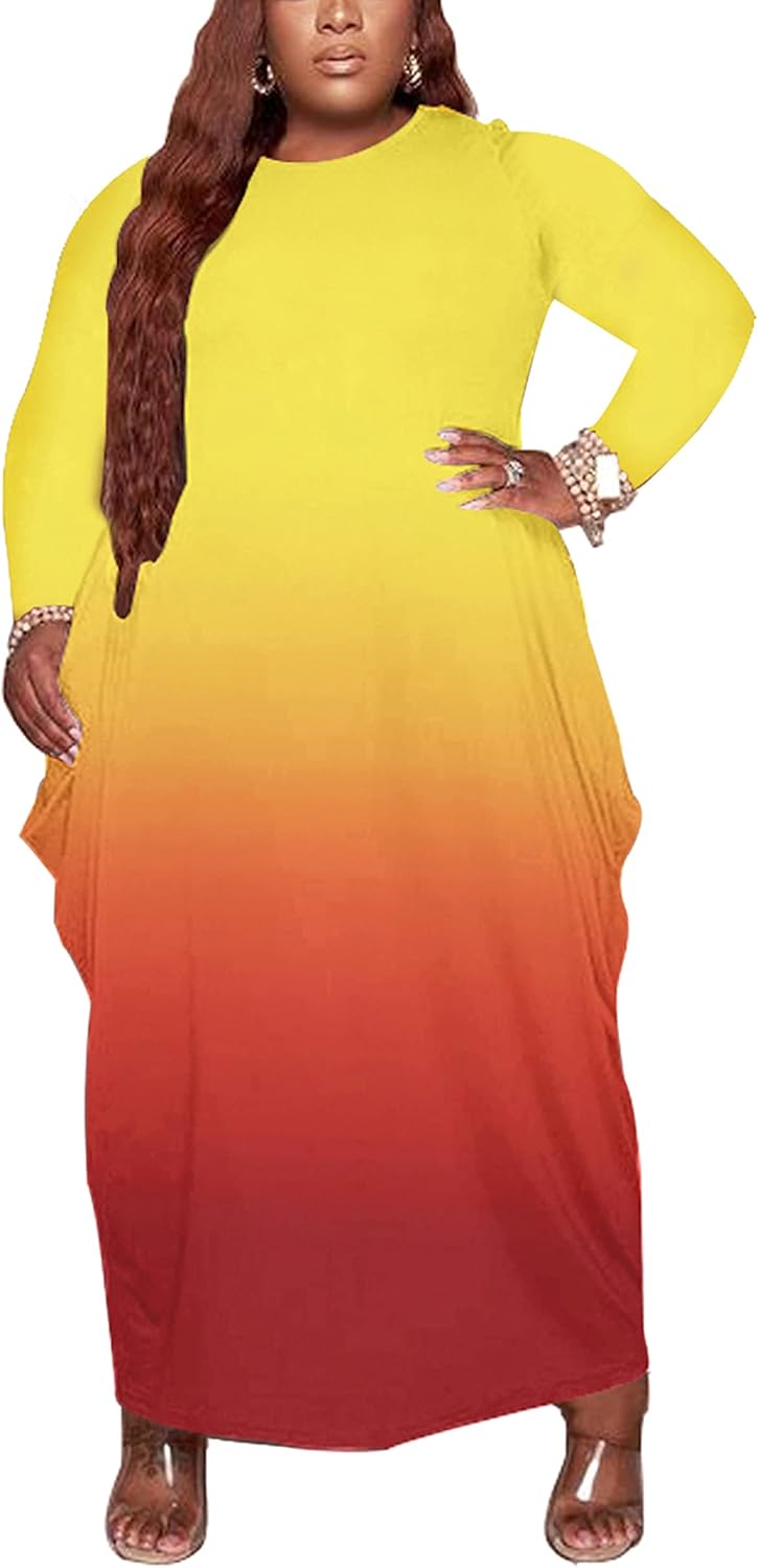 Casual Plus Size Maxi Dresses for Curvy Women Long Sleeve Baggy Long T-Shirt Tunic Dress with Pockets