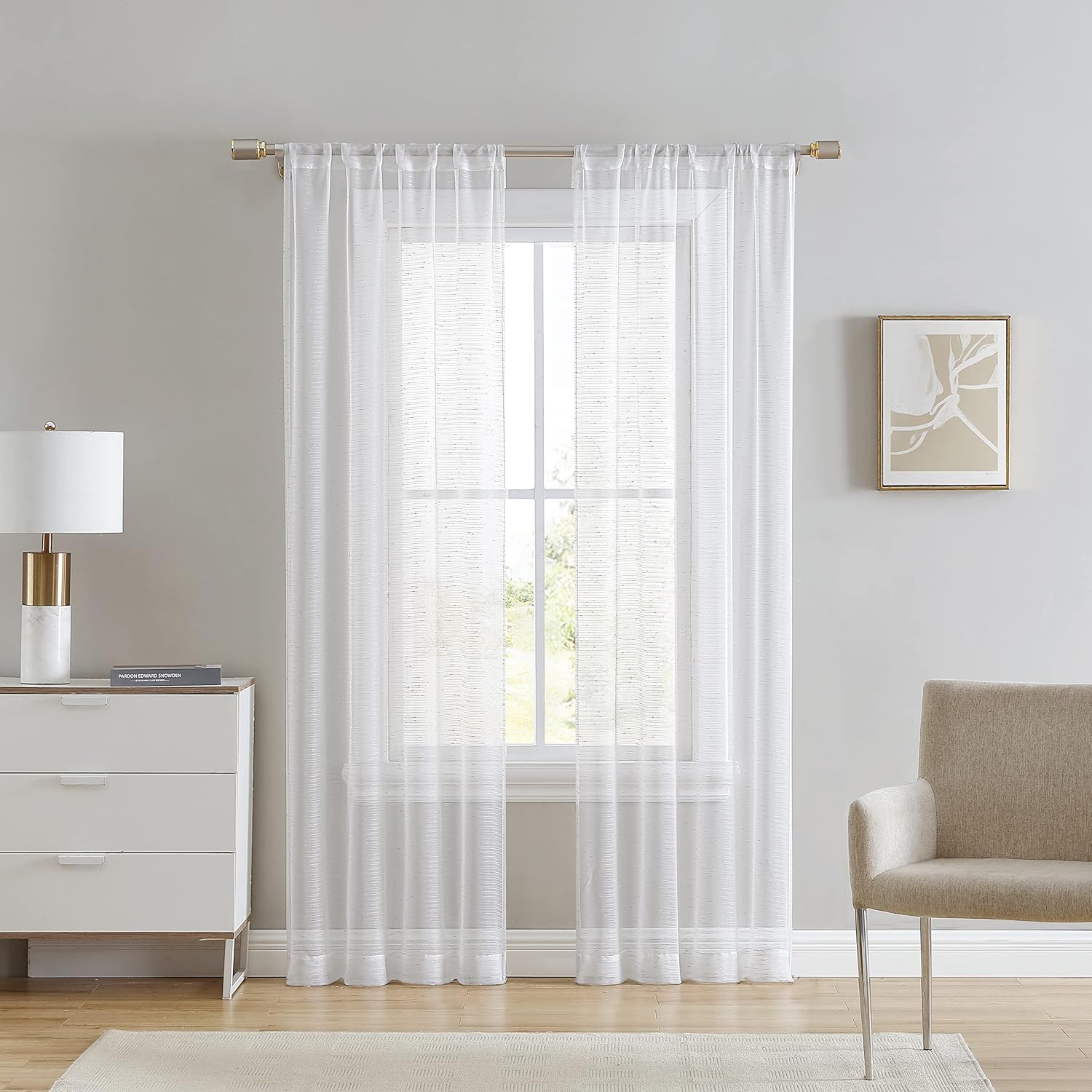 Beatrice Home Fashions Verona Sheer Curtains with Rod Pocket, Features Metallic Finish, Each Panel Measures 38" W x 96" L, White/Silver, 2 Panels