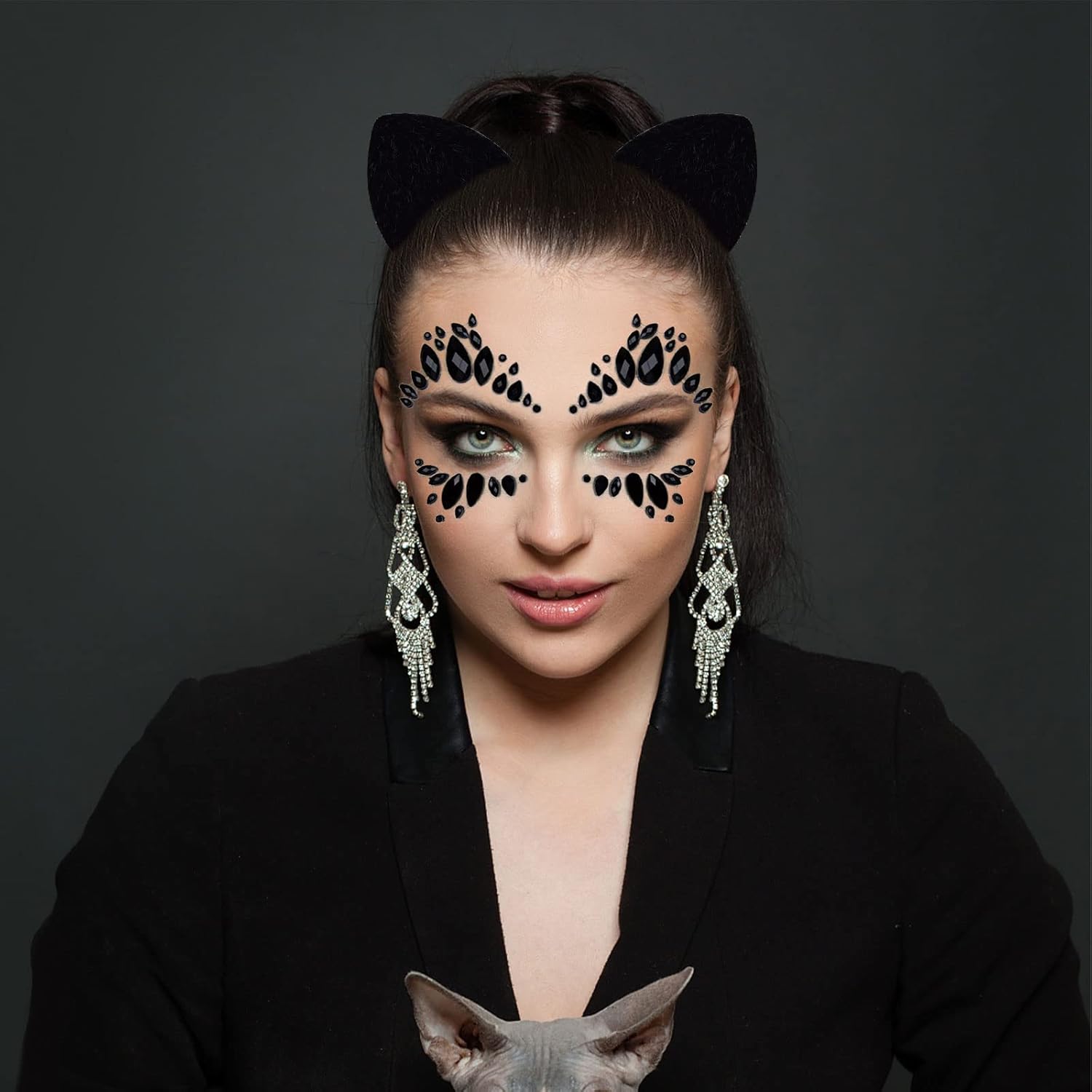 Cat Ears Headband with Face Jewels, Black Cat Ears Cat Costumes for Women Girls Fancy Cosplay Outfit Black Cat Halloween Costumes for Women and Girls