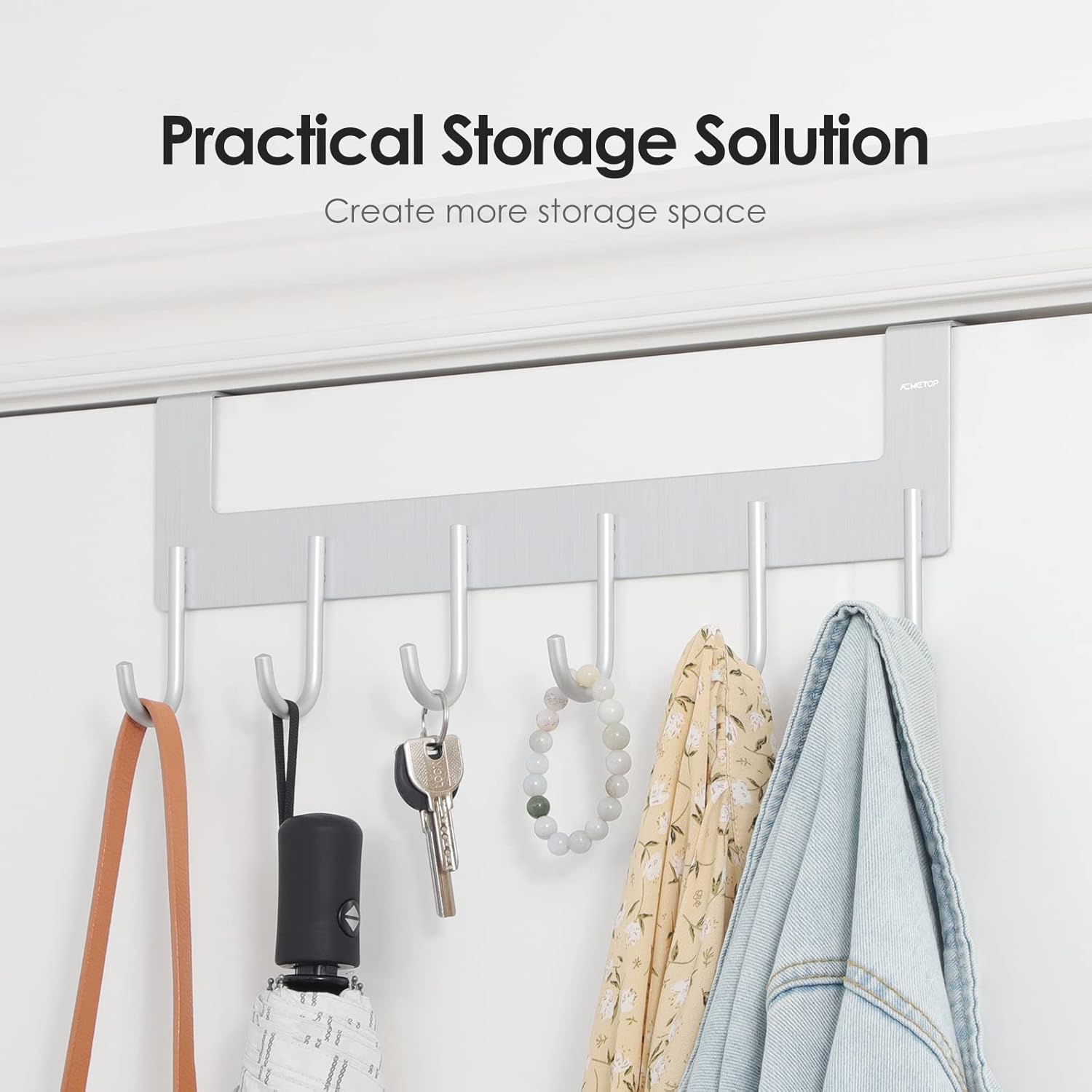 ACMETOP Over The Door Hooks, Aluminum Door Hanger Hook with 6 Coat Hooks for Hanging, Heavy Duty Over The Door Coat Rack for Towel, Bag, Robe, Back of Bathroom, Silver