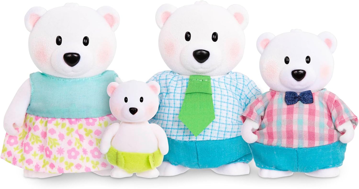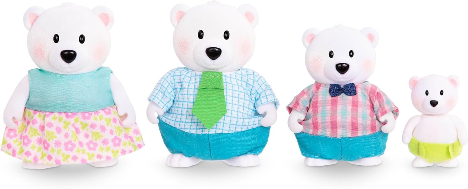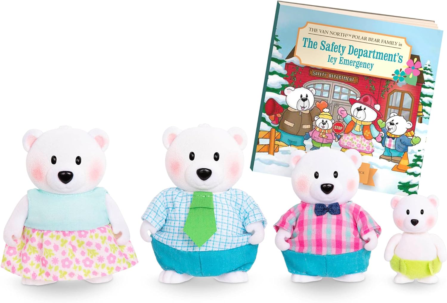 Meet the Van North polar bear Family from Honeysuckle Hollow! This family set includes four animal characters to add to your Li’l Woodzeez collection: Mom Annana, Dad Oslo, and kids Siku and Sesi. They run the Honeysuckle Hollow Safety Department. You can read all about their adventures in the included storybook, “The Safety Department's Icy Emergency". These mini figurines fit in the smallest hands. Their outfits are compatible with the other animal characters from Honeysuckle Hollow, so you can mix and match for a fun try-on session! You can also move their heads, arms, and legs – perfect for hours of playtime. All they need is a bit of imagination to come alive! Li’l Woodzeez collectibles are recommended for kids aged 3 and over. Playsets and other accessories sold separately.