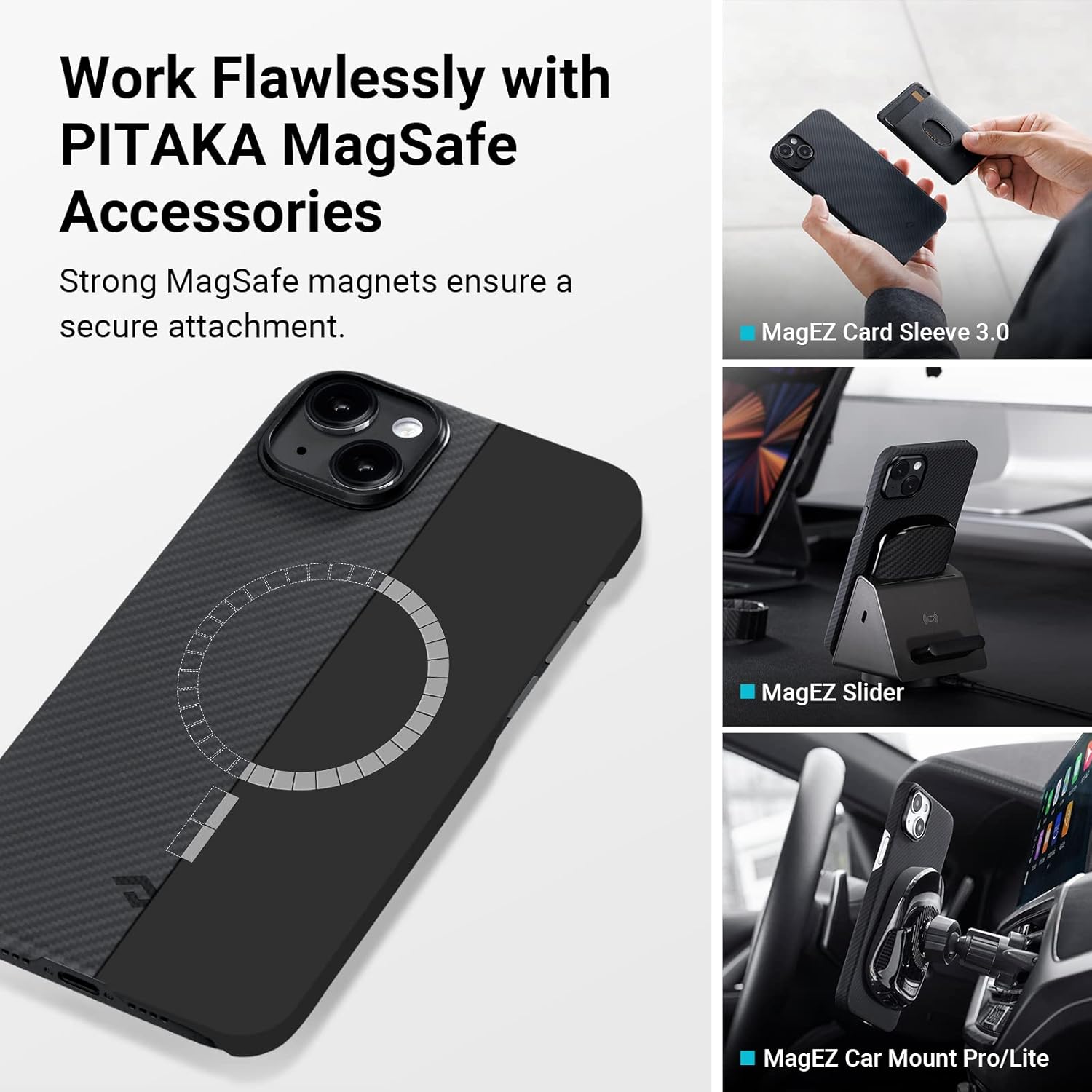 [Fully Compatible with MagSafe] Fully compatible with MagSafe chargers and accessories and PITAKA PitaFlow for Phones (MagEZ Car Mount Pro, MagEZ Slider, and MagEZ Sleeve 3.0). Due to MagSafe SlimBoard technology, the MagEZ Case 3 offers the same wireless charging speed as without a case.