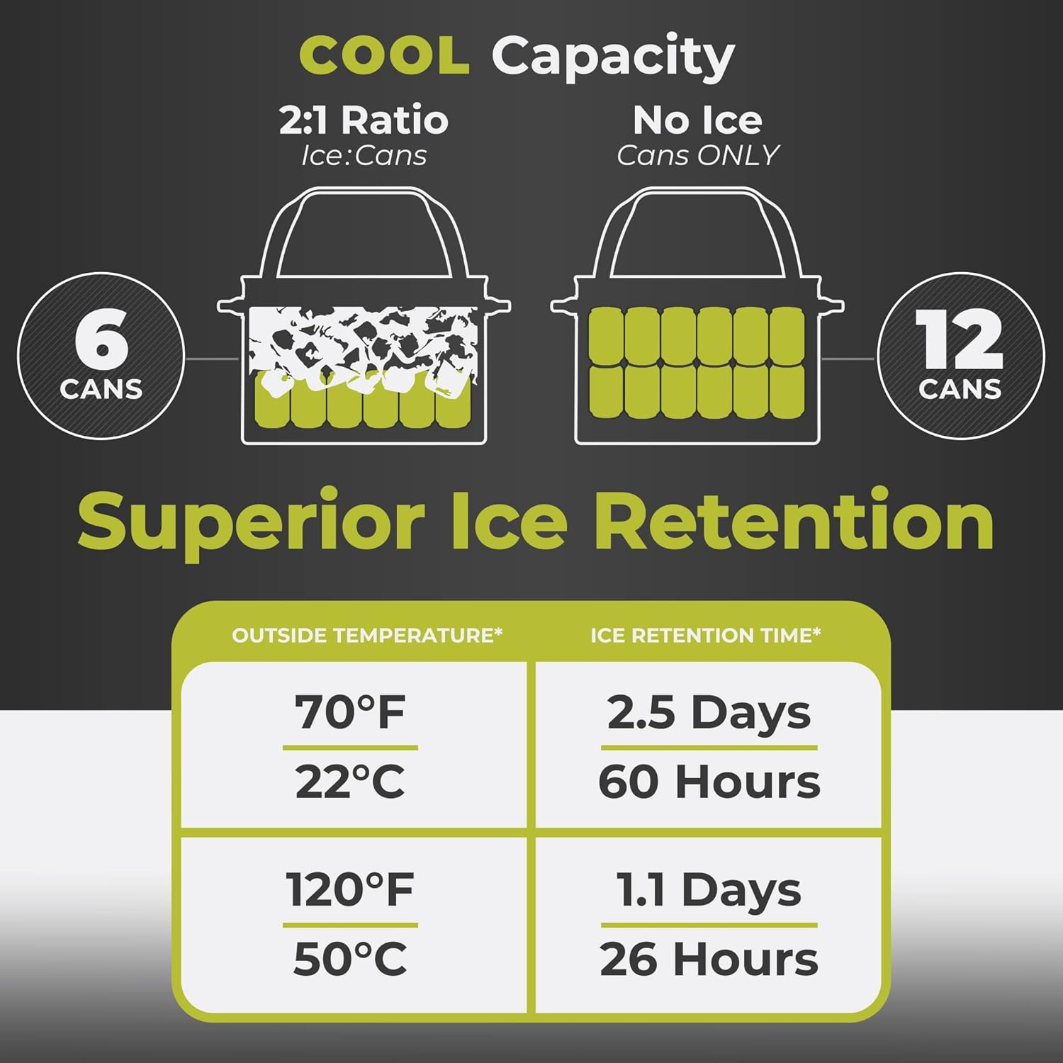 Superior Ice Retention: CORE COOL Insulation keeps contents chilled up to 2.5 days, using high-density EVA foam to retain cold, combined with reflective mylar film to repel heat.