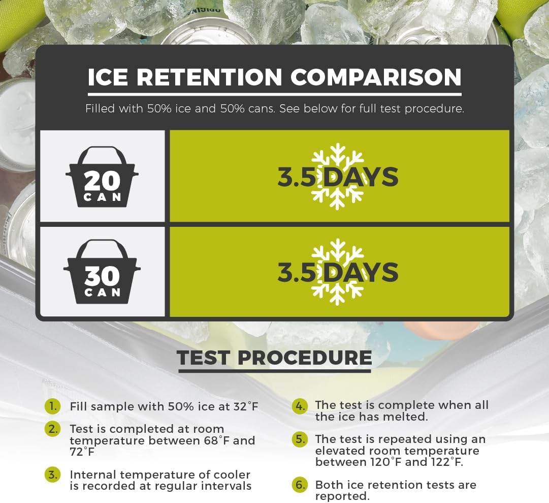 Superior Ice Retention: CORE HYPERCOLD Insulation keeps contents chilled up to 3.5 days, using high-density EVA foam to retain cold, combined with reflective mylar film to repel heat.