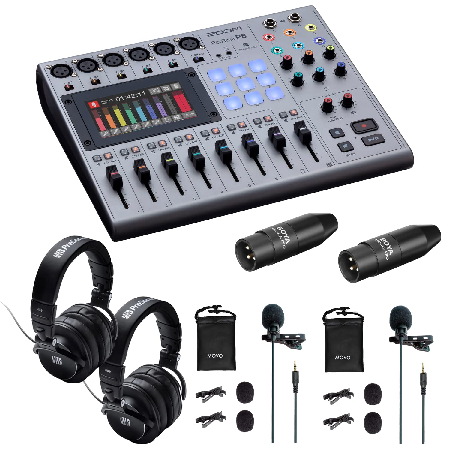 Zoom PodTrak P8 Portable Podcast Recorder, (2) Movo PM10 Lavalier Microphone, (2) BOYA 35C-XLR to 3.5mm, (2) Presonus HD9 Headphones Bundle