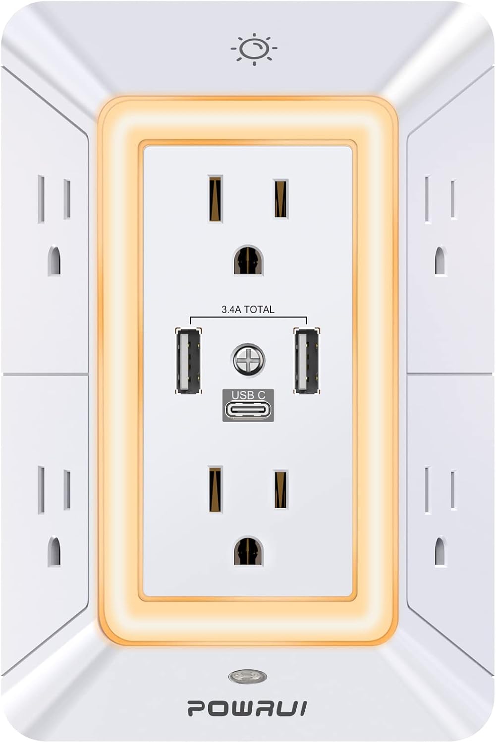 POWRUI Multi Plug 6 Outlet Surge Protector Extender with 3 USB Ports (1 USB C) and Night Light, 3-Sided Power Strip with Adapter Spaced Outlets, ETL Listed, White