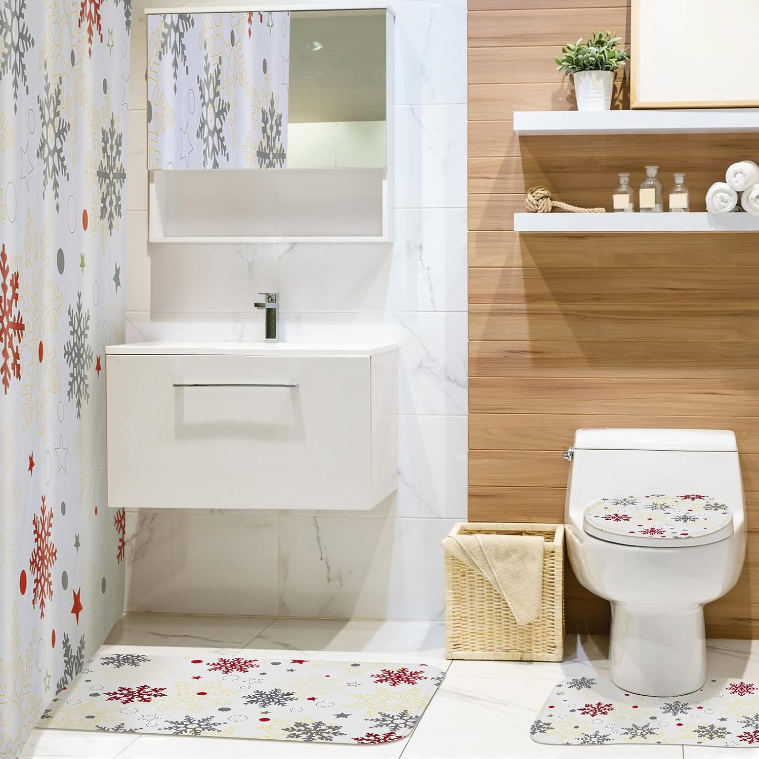 Considerate Bathroom Set: the Christmas shower curtain set includes 1 piece of snowflake shower curtain, 1 piece of snowflake shower mat, 1 piece of U shaped snowflake bathroom rug, and 1 piece of snowflake toilet lid cover, complete and thoughtful, a good combination to satisfy your daily use needs