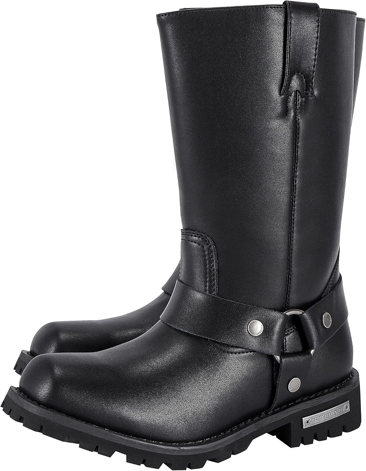 GARGOYLE BELLS Mens Harness Straps Motorcycle Leather Boots Black Waterproof Biker Boots For Men- Low Heel Riding Boots