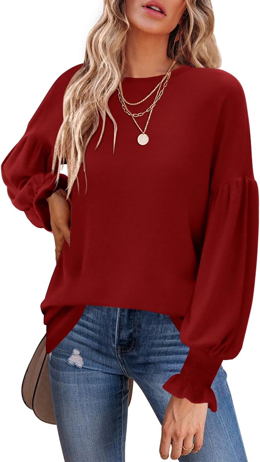 MIHOLL Womens Long Sleeve Tops Crew Neck Ruffle Lantern Sleeve Casual Loose Blouse T Shirts