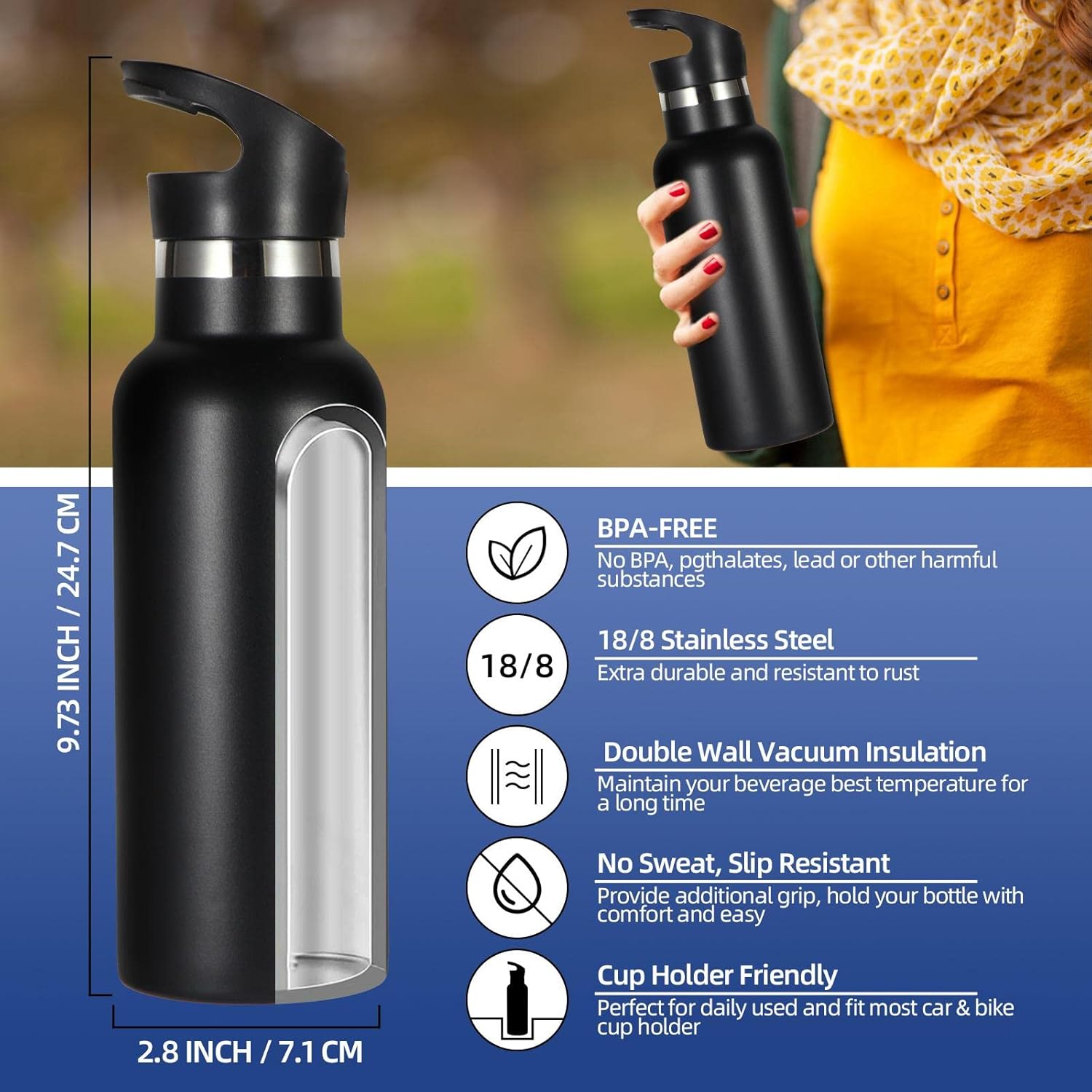 【Vacuum Insulation and nice Size】Designed with double-walled vacuum insulation, featuring superior insulation and a condensation-proof design. Volhoply Water bottle can keep hot for 12 hours and keep cold for 18 hours, allowing you to enjoy your favorite flavor in the long run. The cups fit on the car bike cup holder and inside the backpack for your hiking, biking, beach, camping and fitness