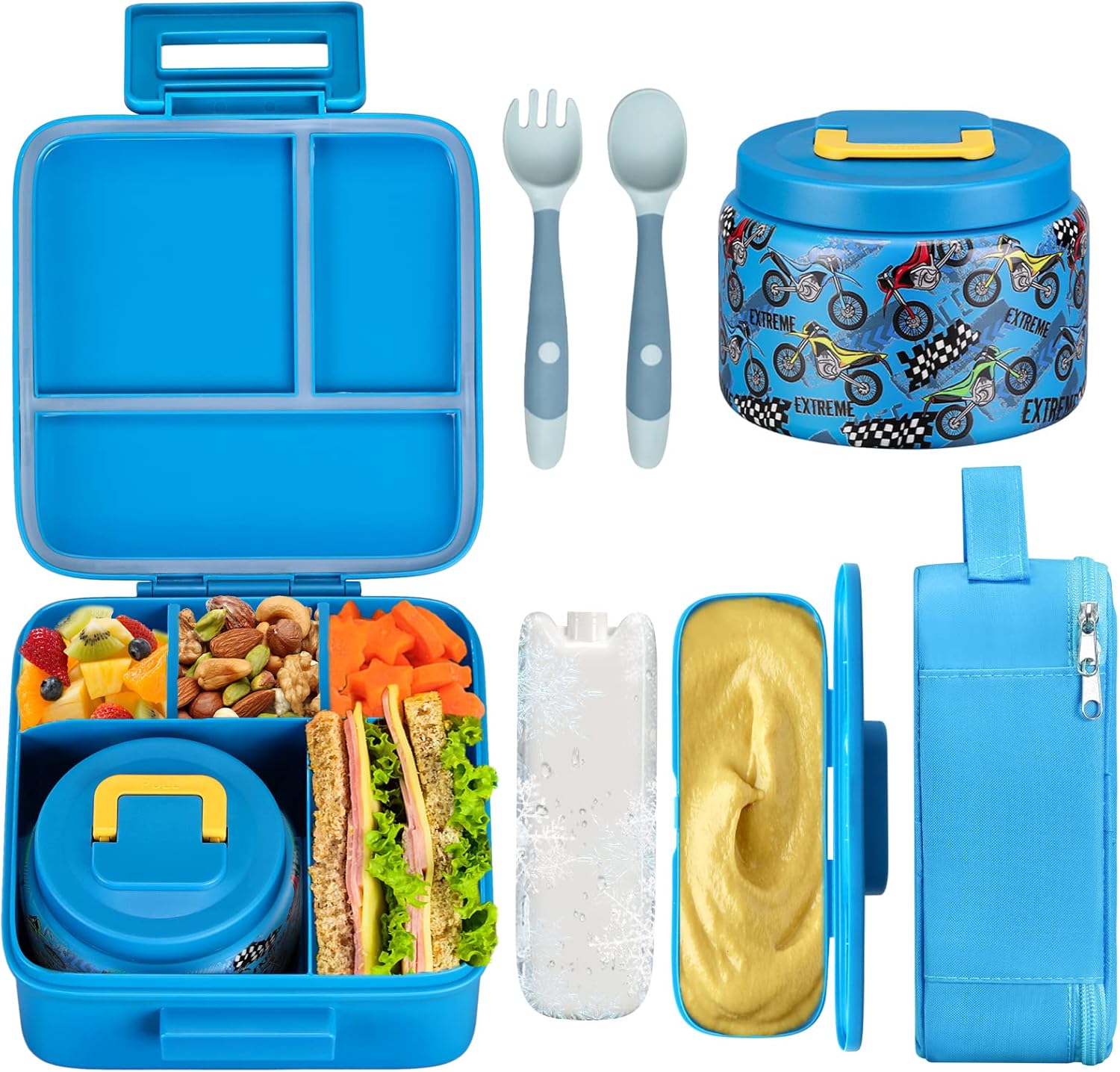 Bento Lunch Box for Kids With 8oz Soup thermo,Leak-proof Lunch Containers with 5 Compartment,thermo Food Jar and Lunch Bag, Food Containers for School (A-Blue(Extreme Locomotive))
