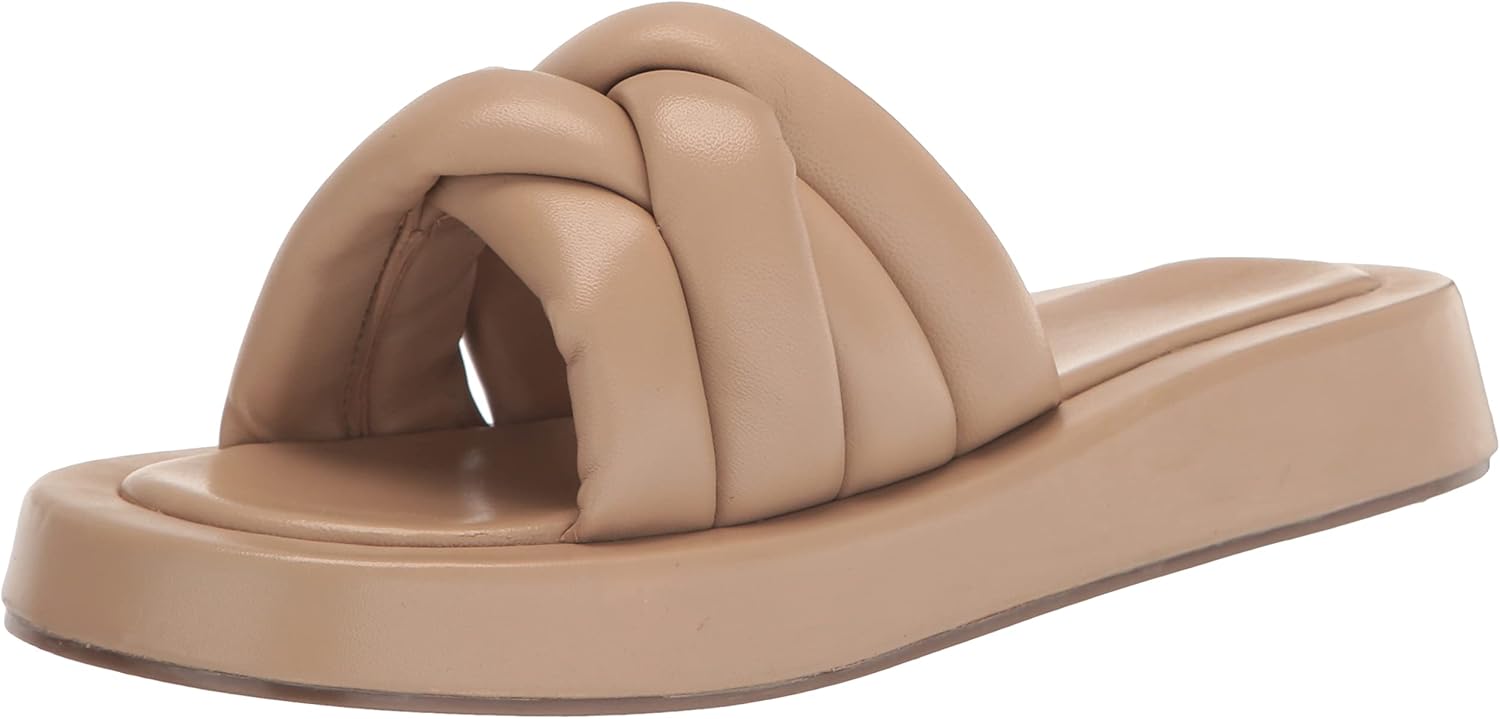 These minimal sport slides feature a puffed woven upper and a supportive leather-lined footbed.