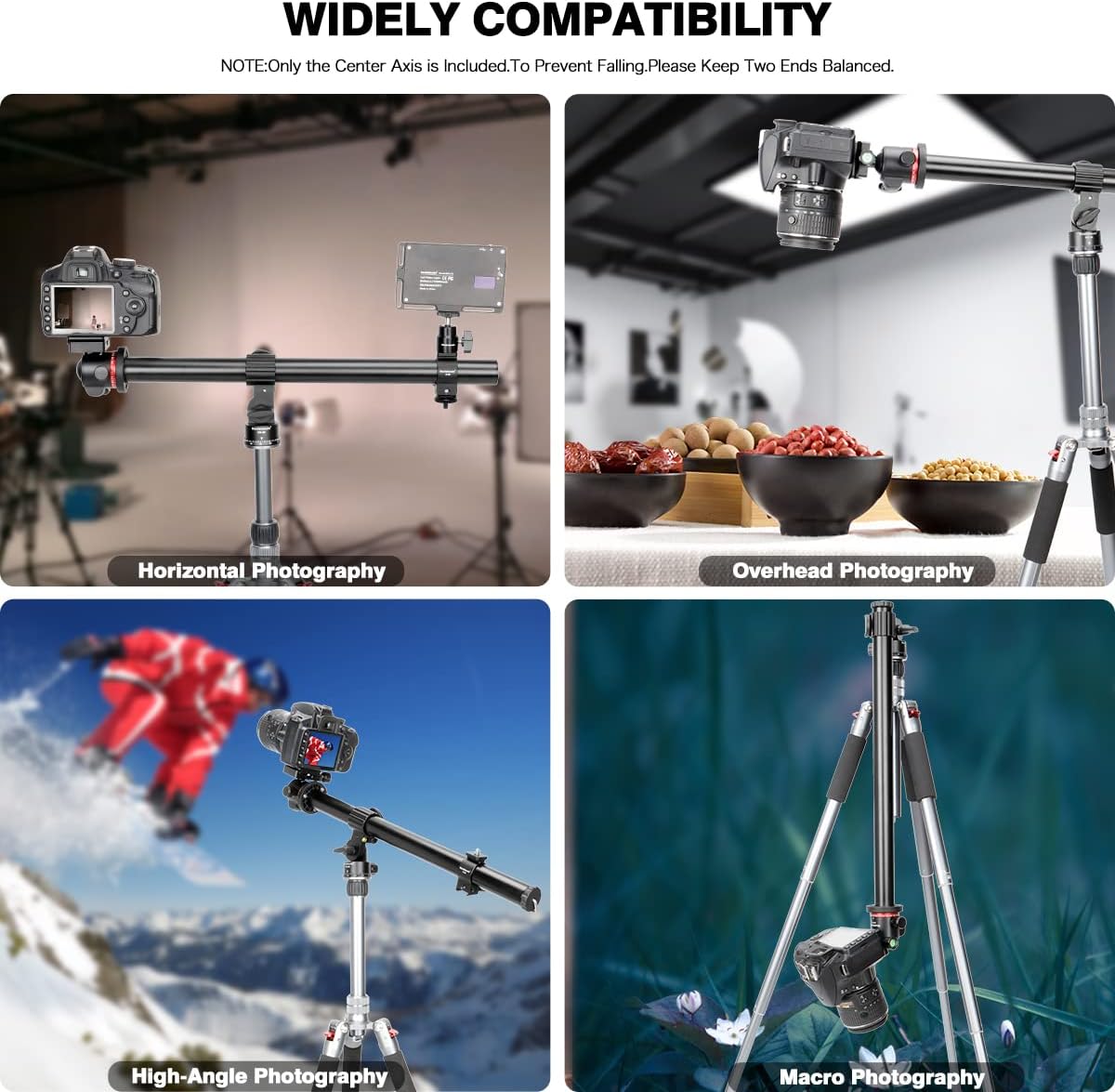 【Professional Tripod Boom Arm】 Aluminum Alloy horizontal tripod arm can be used as an extra center column to increase the shooting height with 28mm diameter tube, durable and solid. Length up to 16.5in / 42cm. The flip lock system is easy to operate;