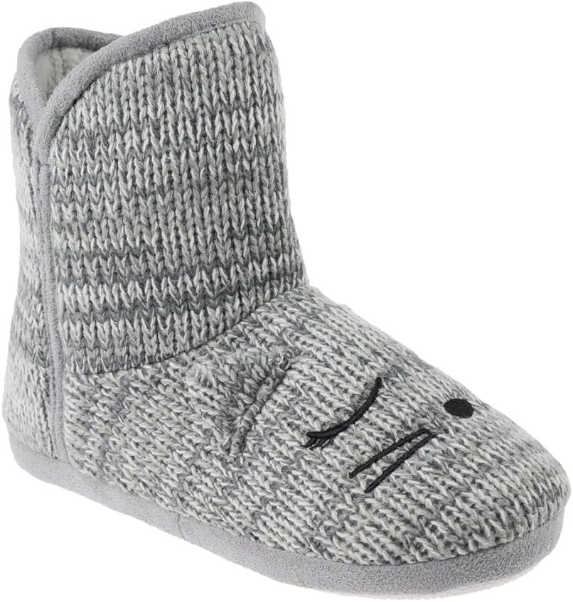 Ladies Knit Sleeping Cat Bootie Slipper with Embroidery, 3D Parts and Fleece Lining, Grey, L (8/9)