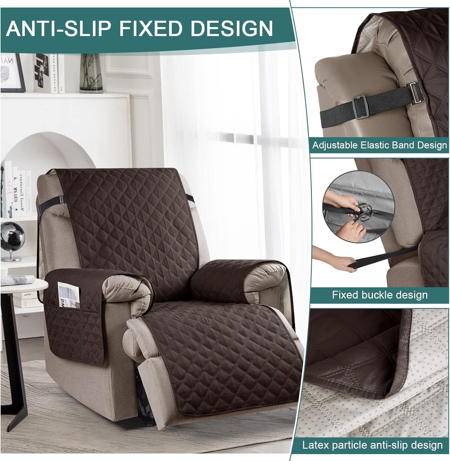 STAY IN PLACE: Solid round colloid design on the back of our recliner cover to reduce slipping; Elastic straps on the top secure the back of the sofa; Elastic band on the seat with round buckles enhance slip resistance