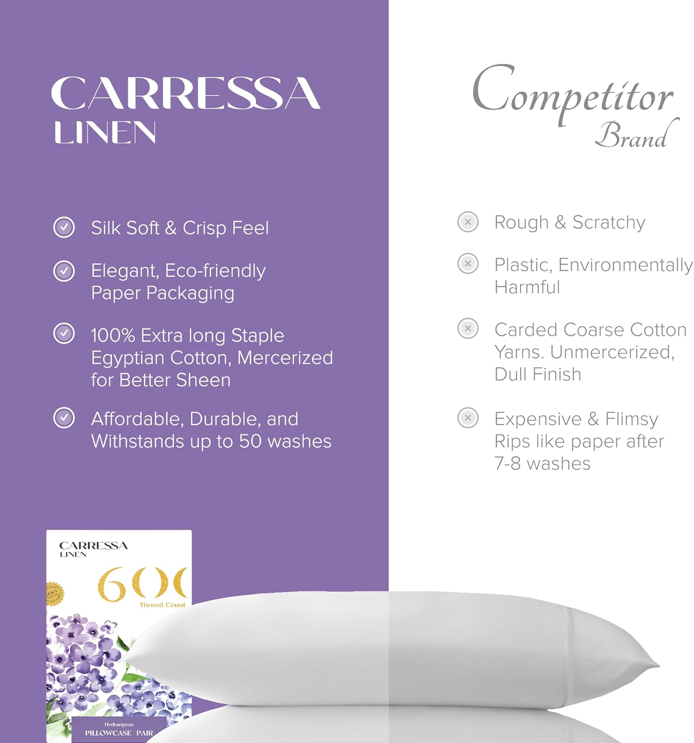 Carressa Linen 100% Egyptian Cotton Pillow Cases Set of 2-600 Thread Count Silver King Pillowcase for Sleeping, Soft, Silky Sateen Weave Bed Pillow Cover, Extra Long Staple Cotton Pillowcases
