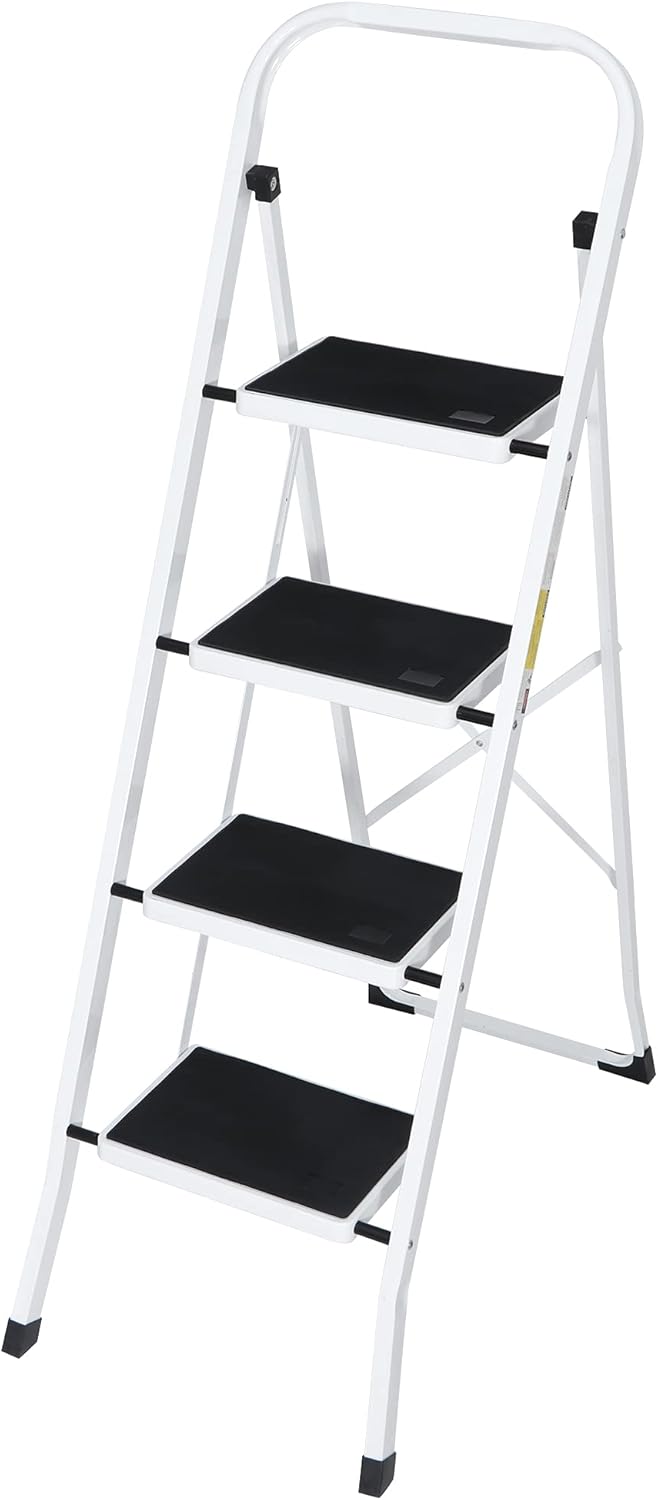 【Security and Stability】Made of High-grade steel frame for strength and reliability. This 4 step ladder features comfortable rubber handgrip widened pedal and non-slip rubber caps on each leg to ensure the ladder remains stable as you're able to climb up the ladder with confidence