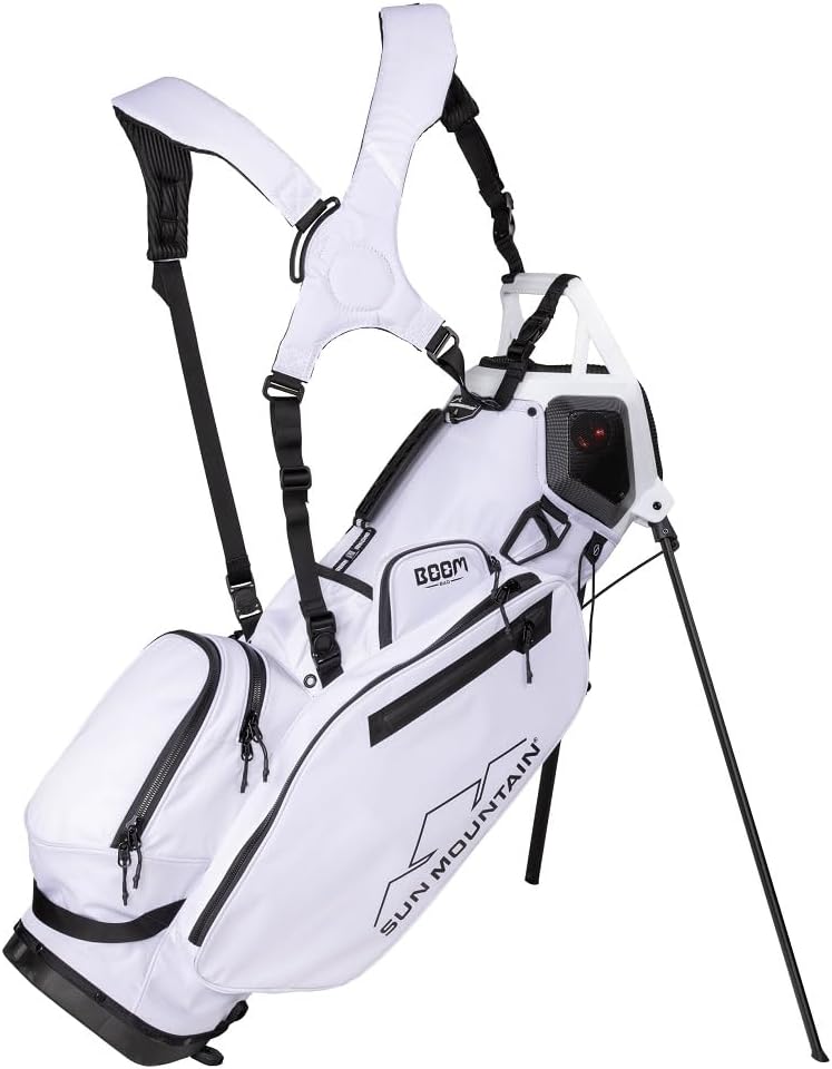 Sun Mountain 2022 Boom Golf Stand BagFeatures: * Built-in speakers with rechargeable Bluetooth controller that can plug into portable charging device * Media pocket has clear vinyl window so you can view and change options or selections on your device * Cart strap pass-through and front-facing pockets allow fullA access when bag is strapped to cart * EZ-Lite Dual Strap System is easy to get on and off and can be used as a single strap * Integrated lift-assist handles for lifting golf bag on and off the golf cart * Pockets: 8 * Large apparel pocket * Velour-lined valuables pocket with multiple slots * Media pocketA * Ventilated cooler pocket * Dual water bottle pouches * Golf ball pocketA * Multiple accessory pockets * Includes matching rainhood