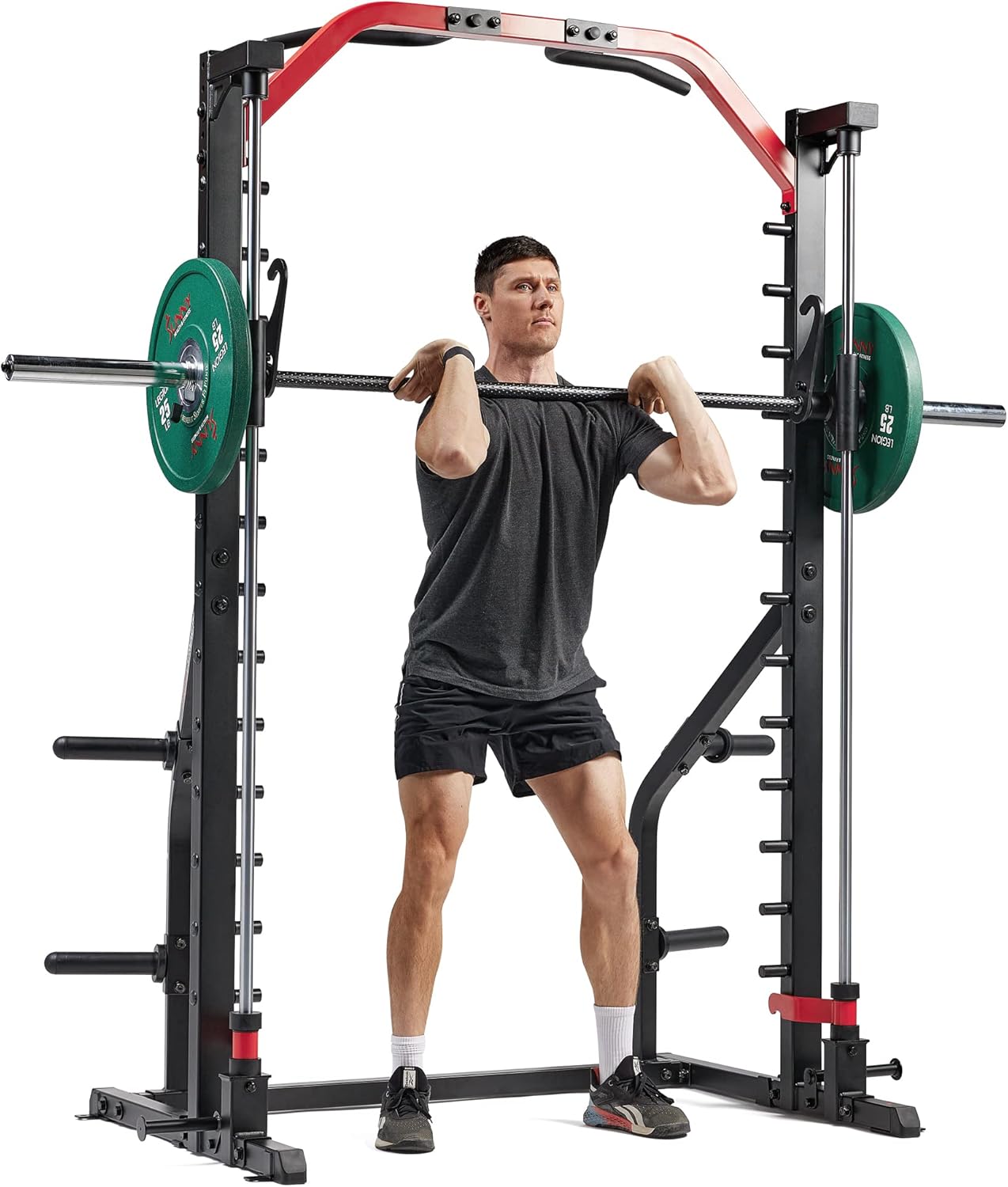 Sunny Health & Fitness Premium Smith Machine & Squat Cage Rack, Pull-Up Bar, Spotter Blocks for Weightlifting & Bench Press for Home Gym Strength Training