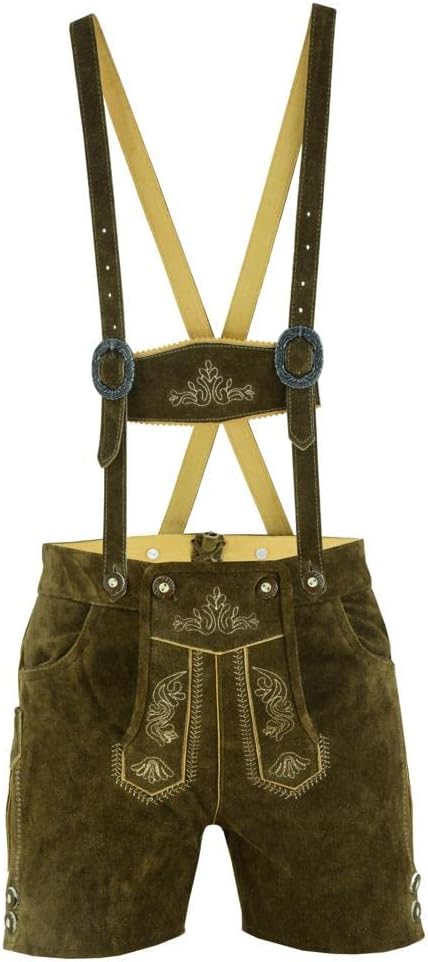 TRENDS Men’s Traditional German Lederhosen – Bavarian Oktoberfest Costume Shorts w/Suspenders – Suede Leather, Knife Pocket