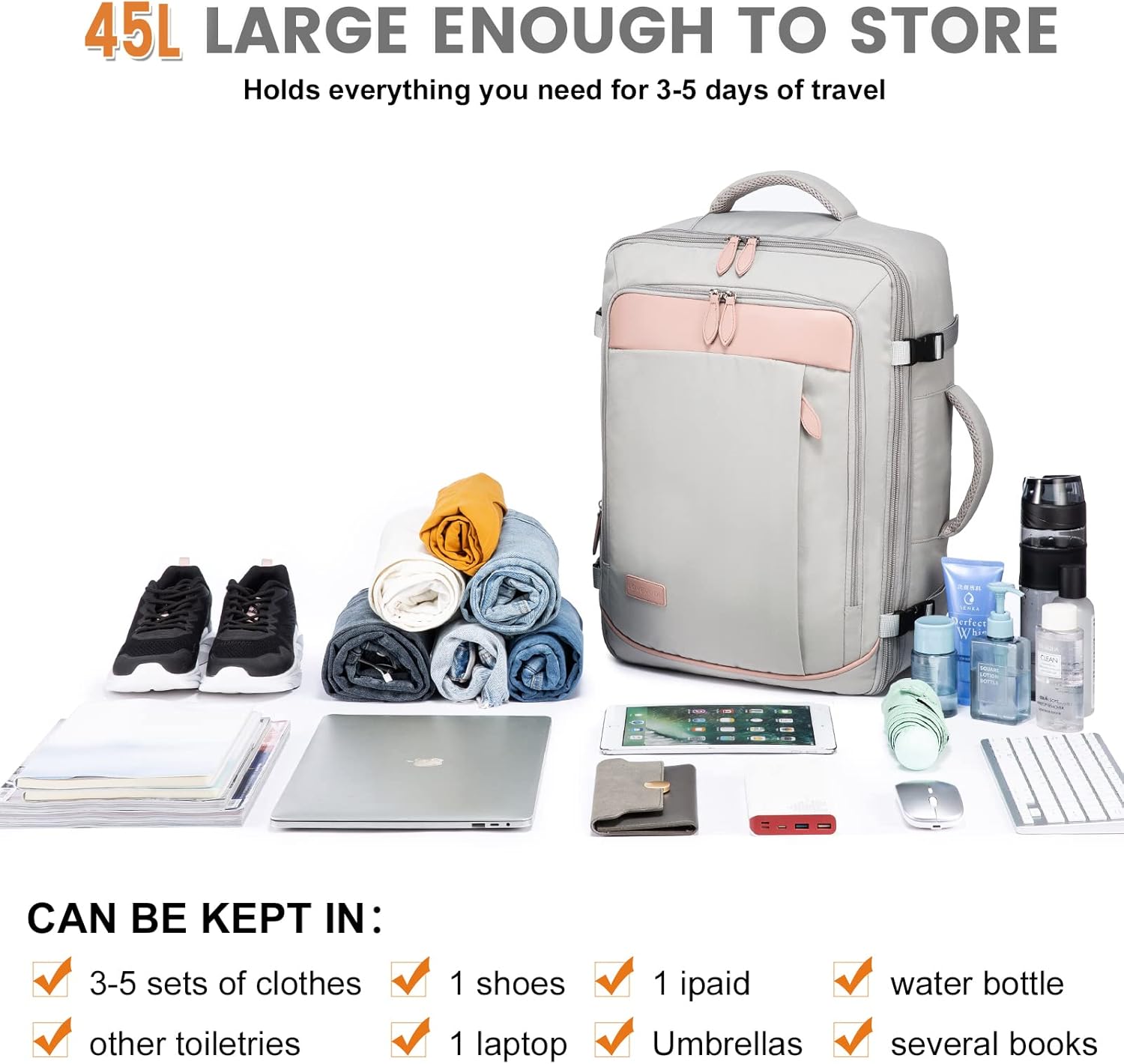[45L EXPANDABLE TRAVEL BACKPACK] This versatile backpack expands from 35L to an impressive 45+L, perfect for 3-7 days of travel. It fits 3-4 sets of clothes, shoes (with a separate bag), and daily essentials, plus a 17.3-inch laptop. It is an ideal travel backpack for men and women! NOTE: This backpack is larger in size, so we recommend considering your needs before purchasing.