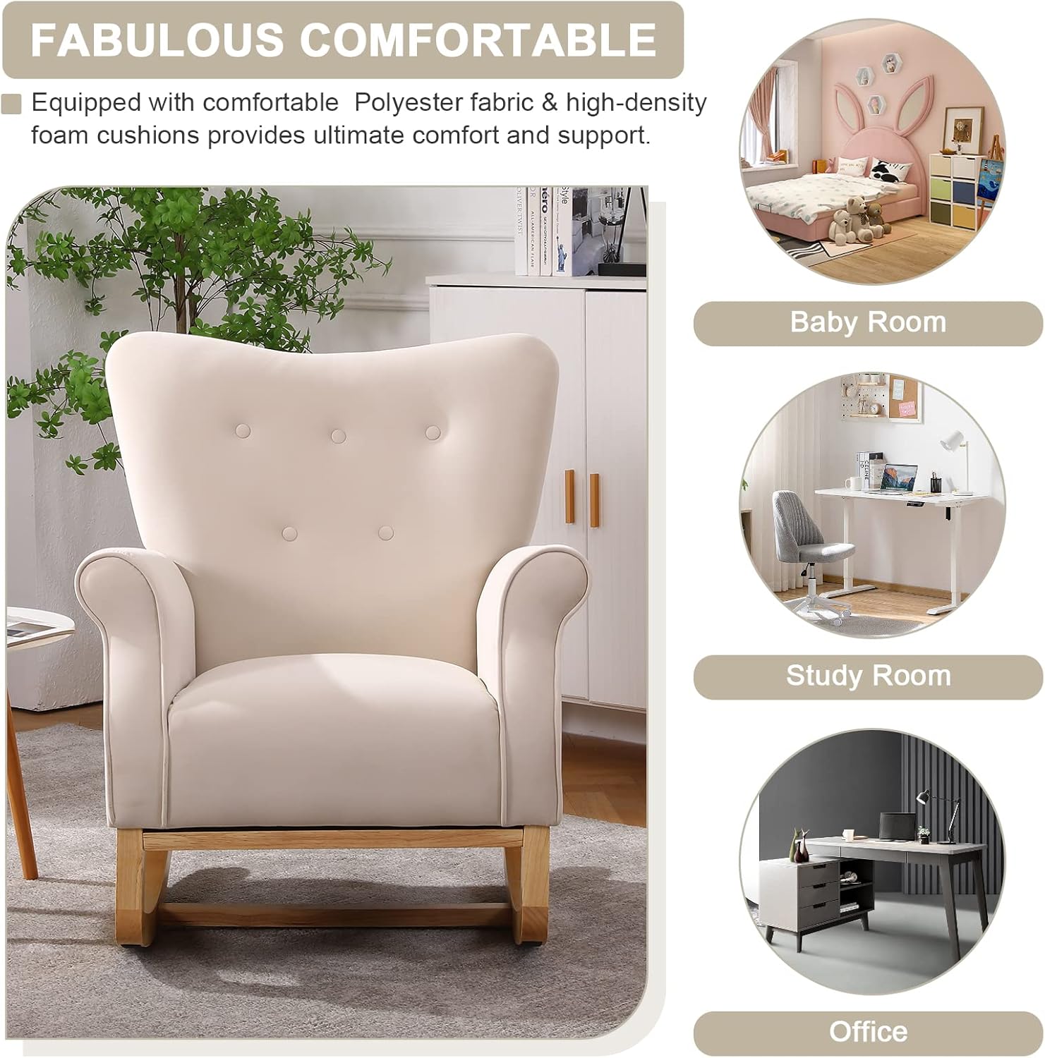 VELVET FABRIC - Nursery rocking chair made of soft, high quality velvet material which bring you gentle touch and elegant feel. And it is durable and will not to fade, wrinkle or pilling after long time use. Padded with thick cushion on the seat and back, it will give you comfortable experience. Suitable for living room, bedroom, nursery, office, patio, balcony, apartment.