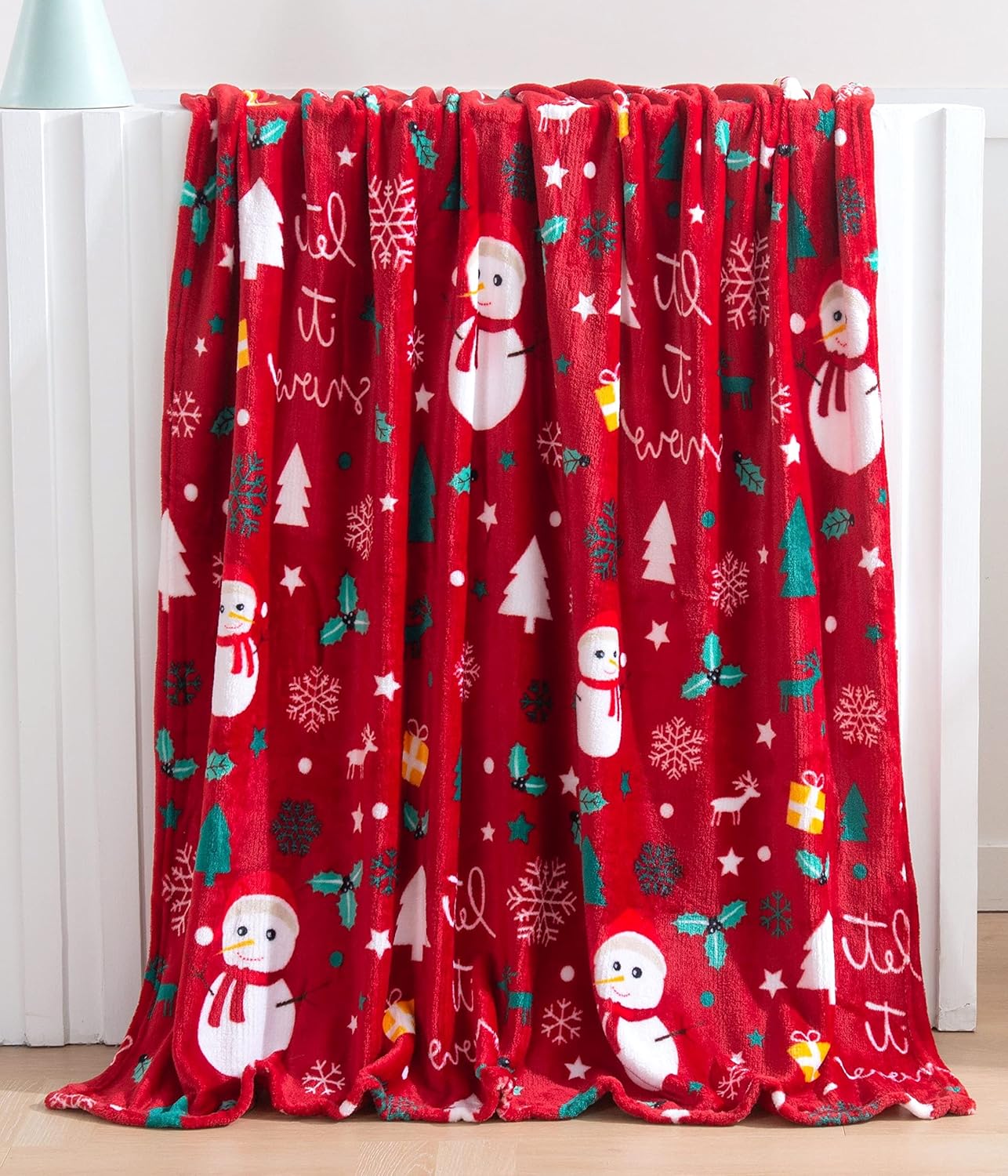 Elegant Comfort Luxury Velvet Super Soft Christmas Prints Fleece Blanket-Holiday Theme Home Décor Fuzzy Warm and Cozy Throws for Winter Bedding, Couch and Gift, 50 x 60 inch, Red Snowman
