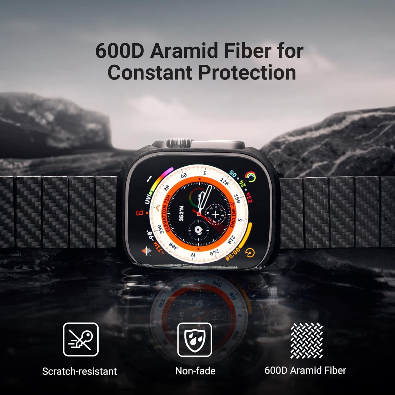 [Premium 600D Aramid Fiber] This Apple Watch Ultra case is made using premium aerospace-grade aramid fiber that is lightweight, scratch-resistant, and highly durable. No interference in the signal, wireless charging and waterresistant function.