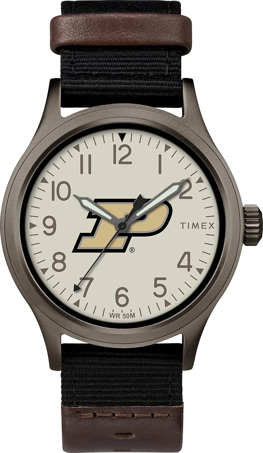 Hemos añadido el logotipo de los Purdue Boilermakers a una de nuestras cajas de relojes favoritas. La caja de acero inoxidable cepillado es resistente al agua hasta 50 metros y la cómoda correa de nylon tejido con acentos de cuero real hace que este sea el reloj perfecto para el día del partido.