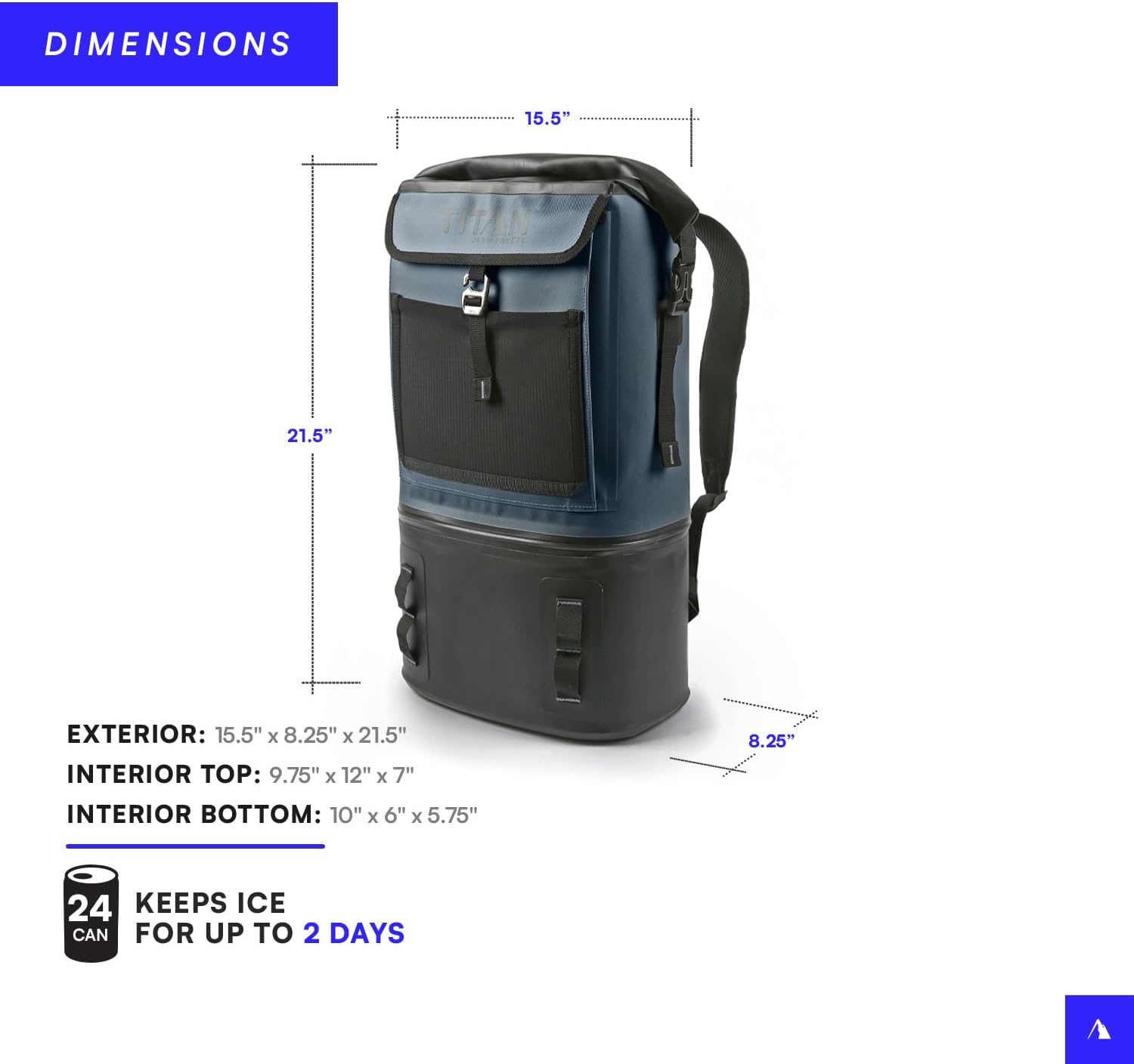 TITAN DEEP FREEZE BACKPACK COOLER: Welded backpack features two waterproof, insulated compartments for optimally storing food and beverages; Keeps ice up to two days and holds up to 24 cans; *Zipper is not leak proof