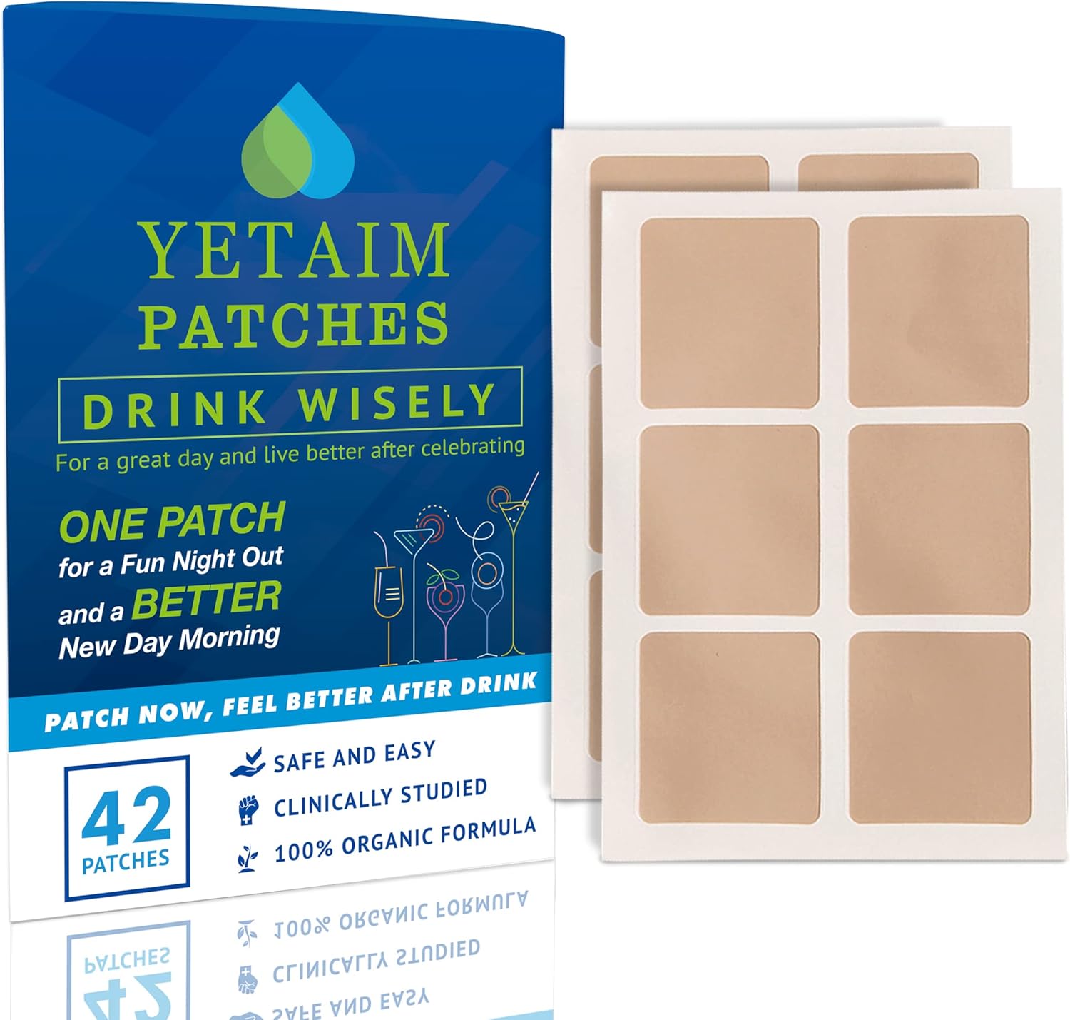 Parches de Recuperación YETAIM para Hombres y Mujeres: Impulso de Energía Recuperación Rápida - Apoyo Día Noche Fiesta - Aplicar en Brazo Cuello Muñeca Espalda para Fiesta Diversión Reanimación Matinal (Azul Claro, 42 Parches)