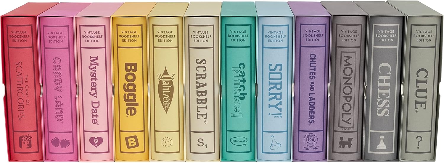 COLECCIÓN DE 12 JUEGOS DE TABLERO CLÁSICOS VINTAGE DE WS GAME COMPANY Esta Colección Especial incluye 12 Juegos de Tablero Clásicos Vintage producidos por WS Game Company. Los diseños de estas Ediciones de Estante Vintage fueron inspirados por los gráficos vintage de ediciones clásicas del juego. Los diseñadores de juegos han creado un método de almacenamiento elegante que permite guardar cada juego y todos sus componentes en tu estantería entre los clásicos. La adición de componentes de juego premium hace que los clásicos sean disfrutados por generaciones venideras. Los 12 Títulos de Juegos Incluidos: Scrabble, Monopoly, Clue, Boggle, Yahtzee, Catch Phrase, Scattergories, Ajedrez, Sorry!, Candy Land, Chutes and Ladders, Mystery Date. Cada estantería mide aproximadamente 10.6 x 8.4 x 2.6 pulgadas y pesa entre 2 y 3 libras cada una. Chutes and Ladders y Candy Land son apropiados para 2 a 4 jugadores, edades de 3 y más. Sorry! es apropiado para 2 a 4 jugadores, edades de 6 y más. Yahtzee es apropiado para 1 o más jugadores, edades de 8 y más. Scrabble y Mystery Date son apropiados para 2 a 4 jugadores, edades de 8 y más. Monopoly es apropiado para 2 a 8 jugadores, edades de 8 y más. Clue es apropiado para 3 a 6 jugadores, edades de 8 y más. Boggle es apropiado para 2 a 6 jugadores, edades de 8 y más. Catch Phrase es apropiado para 4 o más jugadores, edades de 12 y más. El Ajedrez es apropiado para 2 jugadores, edades de 9 y más. Scattergories es apropiado para 2 a 4 jugadores, edades de 12 y más. Catch Phrase tiene un temporizador electrónico aleatorio que requiere 2 pilas "AAA" que no están incluidas.
