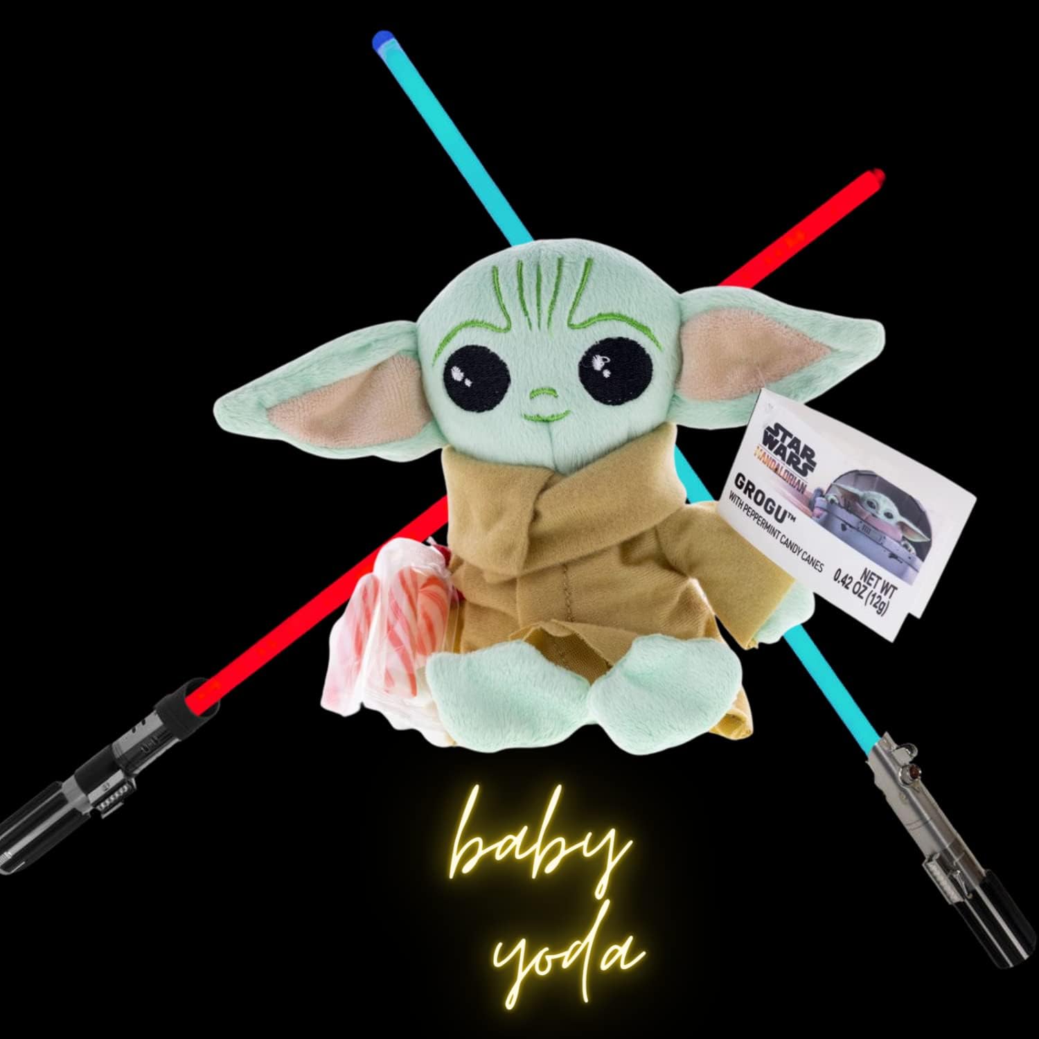 Spread some holiday cheer with this adorable Baby Yoda plush and candy cane set! The Child, affectionately known as Baby Yoda, has been taking the world by storm ever since he first graced our screens in The Mandalorian. Now, you can bring home your very own version of this lovable character. This set includes an 8-inch plush toy of The Child and two candy canes. It's the perfect gift for any Star Wars fan or anyone who could use a little holiday cheer. So don't wait, order your set today! Intended for Ages 15 and Up