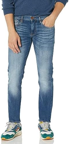 A|X Armani Exchange Men's distressed, slim fit, stretch jeans in Indigo denim. 5 pockets included