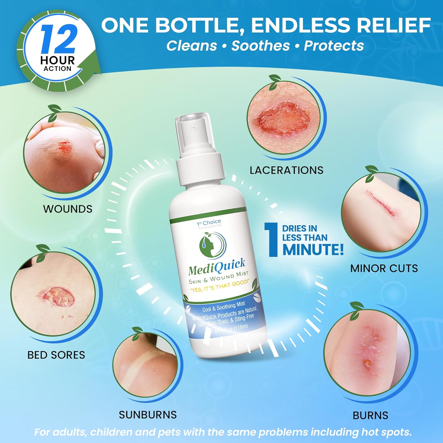 MediQuick Antiseptic Spray Mist 4 Fl Oz | Skin & Wound Repair First Aid Spray for Burns & Cuts with 12 Hour Action | Helps Heal Acne Rash Eczema Itch Bites & More | Safe Wound Wash with No Sting