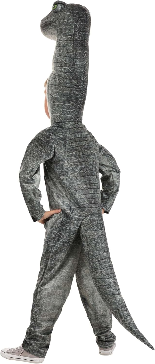 Let your child step into the age of the dinosaurs with this adorable and comfortable Brontosaurus Dinosaur Costume for Kids. Designed for both fun and ease of wear, this costume delivers the iconic look of one of the most beloved plant-eating giants of the prehistoric era. From its tall neck and gentle face to its swinging tail, this full-body outfit brings dino dreams to life in a soft, wearable design your child will love. The costume features a single-piece hooded jumpsuit made from 100% polyester velour fabric that’s soft to the touch and lightweight enough for indoor or outdoor use. A full-length zipper down the front makes it easy to slip on or off, whether you're getting ready for school, a costume party, or Halloween night. The plush, fiber-filled tail sewn into the back of the suit adds just the right amount of bounce and sway as your little dino walks or plays. The standout feature of this costume is the sculpted Brontosaurus neck and head. The hood is supported by inner foam backing that helps the stuffed neck stay upright while your child wears it. The dinosaur’s head is stuffed with fiberfill and features printed eyes, nostrils, and soft sculpted brow ridges to give it a friendly, expressive face. This unique design allows the Brontosaurus to appear as if it’s towering above your child’s head—just like in the real prehistoric world. Available in sizes X-Small through X-Large, this costume is perfect for a wide variety of uses. Whether they’re trick-or-treating, attending a dinosaur-themed birthday party, participating in a school play or science fair, or visiting a museum, this costume is a comfortable and fun way to engage with their favorite prehistoric creatures. It also pairs perfectly with other dinosaur costumes for siblings or friends, making it a great group theme.