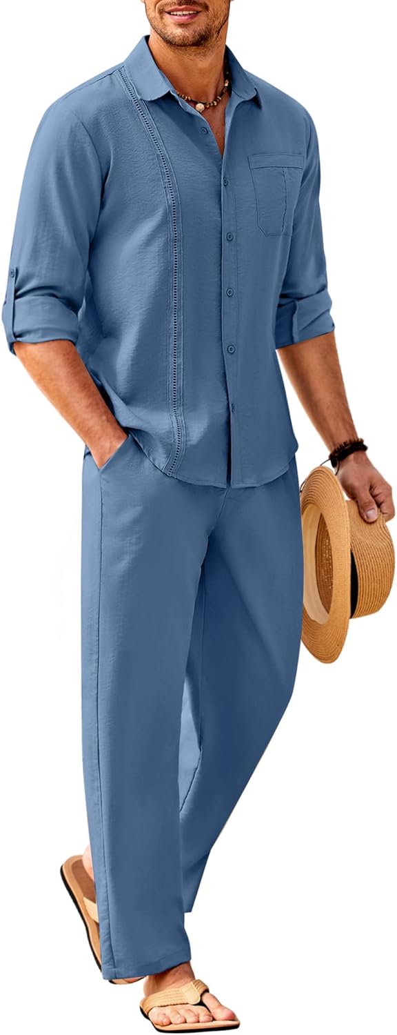 COOFANDY Mens Linen Sets 2 Piece Long Sleeve Button Down Cuban Shirt and Pants Set Summer Beach Set Outfits