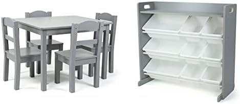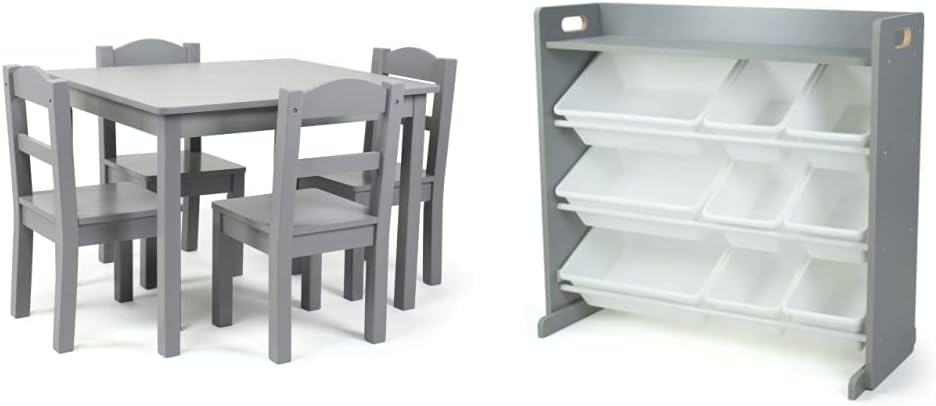 Humble Crew Kids Wood Table and 4 Chair Set, Grey"Perfectly sized to meet your growing child’s needs, the Humble Crew 5-Piece Kids Wood Table and 4 Chair Set is sturdy, stylish and simple to clean. This set can be used as a homework study desk, an arts and crafts activity center, or a board game table. It is also a great homeschooling solution for young students doing online school from home. The height of this furniture is just right for toddlers and preschool-aged children; giving your little one a table and chair set at their size gives them a sense of control and helps them learn independence. From snack time to playtime this set will quickly become your little one's very own favorite spot in the house to draw and color, read, do puzzles, host tea parties, play cars and trucks, and more. The set includes a rectangular table and four chairs in a contemporary and versatile grey finish sure to complement your home's existing furniture whether it be in your toddler's bedroom, playroom or the living room. This furniture set is easy to assemble with all hardware included. The sturdy table and chairs feature solid wood legs for additional support and long-lasting durability, ideal for boys and girls aged 3-8 years. Product Sizing— Table Height: 19" Table Top: 22"W x 26"D Chair: 10"W x 10"D x 20"H Chair Seat Height: 10" Each chair holds up to 50 lbs.Humble Crew Inspire Toy Organizer with Shelf and 9 Storage Bins, Grey/WhitePlaytime is more fun when your kids can easily take out their toys, books and games and then quickly clean up afterwards. The space-saving Humble Crew Toy Storage Organizer with Shelf and 9 Storage Bins stows your children's toys in easy-to-see, easy-to-access BPA and phthalate free plastic storage bins. 6 standard and 3 large storage containers are easy to remove, replace and reposition along the 3 tiered shelves—sized just right within the toy organizer for toddlers and preschool-aged children. The top ledge on this kid's storage unit is the perfect space to display books, dolls or other favorite small toys, pictures and other decorative items, providing an additional level of easy-to-see and easy-to-access open storage for your convenience. It makes a great toy box storage alternative, helping keep your little one’s room clean and organized while at the same time teaching sorting and cognitive skills. The stylish grey colorway makes this the perfect organizational solution for bedrooms, nurseries, playrooms and classrooms. Made with a sturdy engineered wood construction frame and steel shelving rods, each level can hold up to 20 pounds. Some assembly is required and all hardware is included. Product sizing – 34"W x 11"D (16"D with stabilizing braces) x 31"H Standard bin sizing: 12"L x 9"W x 6"H Large bin sizing: 16"L x 12"W x 6"H Additional plastic storage toy bins are also sold separately.