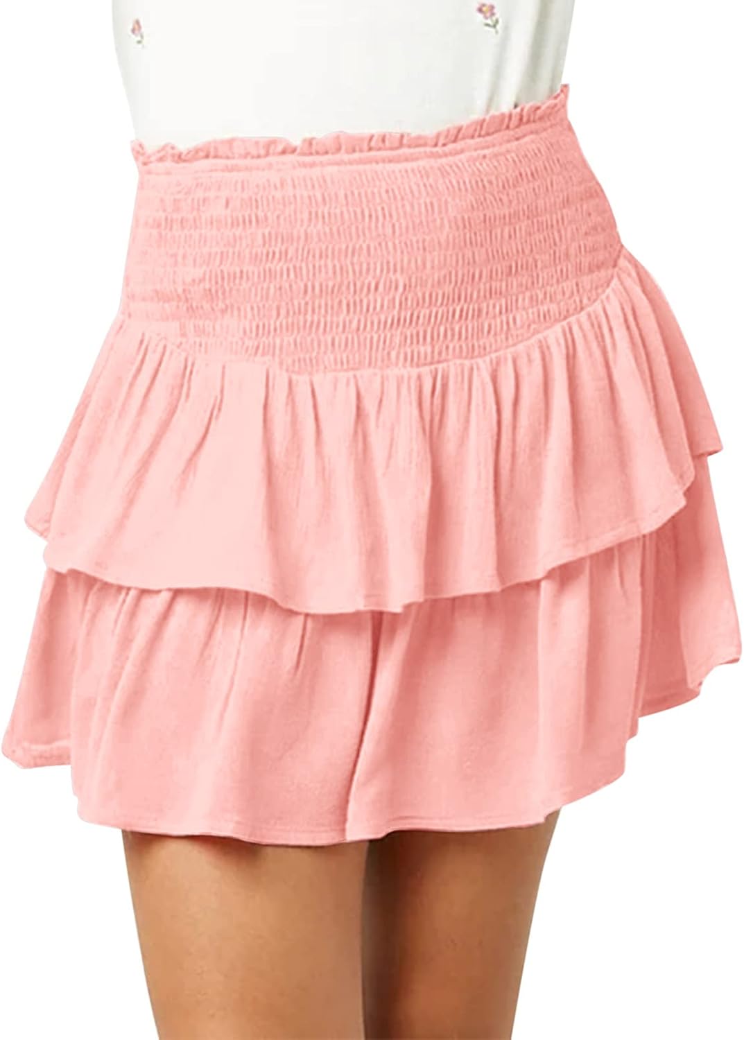 Newffr Girls Smocked Ruffle Mini Skirts Cute High Elastic Waisted Tiered Short Skirt with Shorts Underneath
