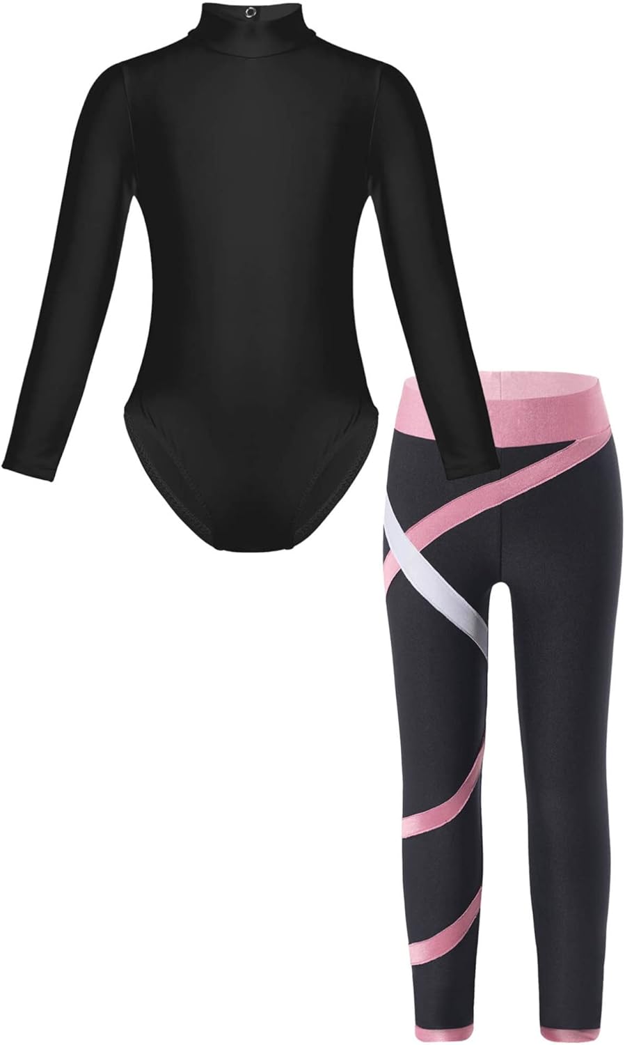 TiaoBug Kids Girls Long Sleeves Gymnastics Ballet Dance Leotard and Leggings Athletic Dancewear Activewear Set
