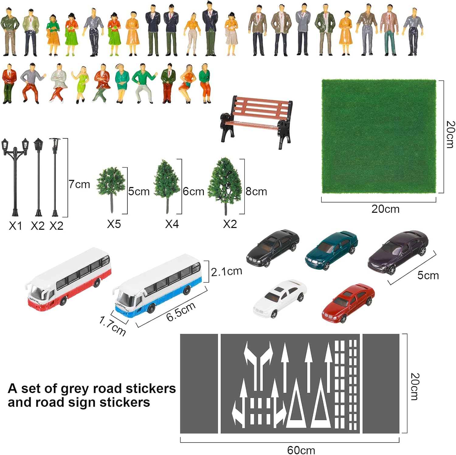 Abundantes modelos y manualidades: recibirás 20 modelos de pie y 10 sentados de 1:50 personas en miniatura, luces temáticas de 5 yardas, 11 árboles en miniatura, incluidos 5 en 1,97 pulgadas/5 cm, 4 en 2,36 pulgadas/6 cm y 2 en 3,15 pulgadas/8 cm, 5 bancos de color marrón, 4 jardines en 7,87 x 7,87 pulgadas/20 x 20 cm, 5 coches en 1:100, 2 autobuses en azul y colores amarillos, 1 hoja de pegatinas grises y 1 hoja de 1:50 mientras se marca la línea; la cantidad es suficiente para que puedas crear un paisaje ferroviario realista y delicado: nuestras personas en miniatura fabrican, simulan árboles en miniatura, coches y otros modelos están restaurados y diseñados de la manera más vívida y apropiada posible, y los colores son brillantes y delicados para mostrarlos mejor en la construcción de la escena en miniatura; además, la colocación de árboles, césped y marcas viales también es ideal para algunas escenas de parques y carreteras.