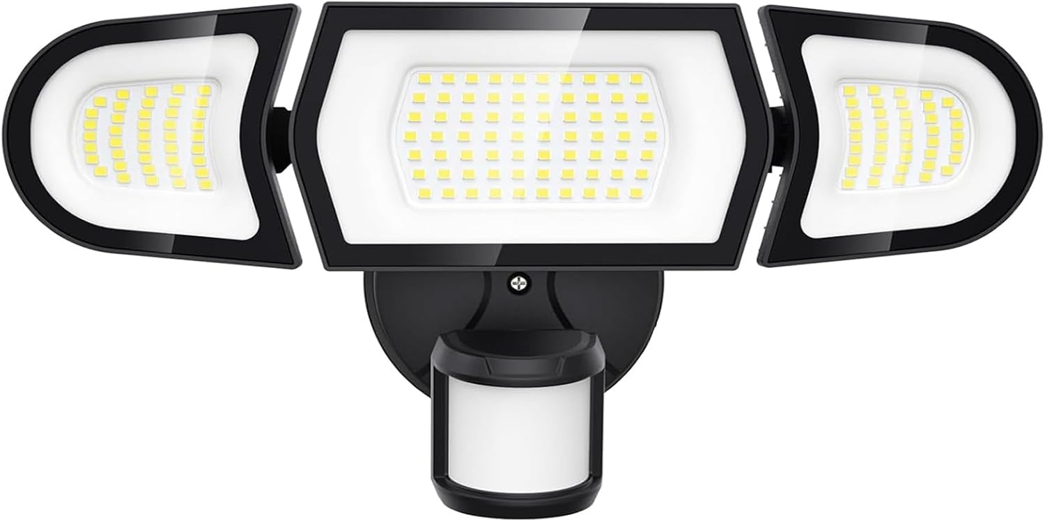 Light Up Wide Coverage: This 9,000 lm motion lights for outside lights up yards, garages, driveways, and more. Its 3-headed adjustable design provides 270-degree coverage, illuminating up to 1350 square feet to enhance home security at night