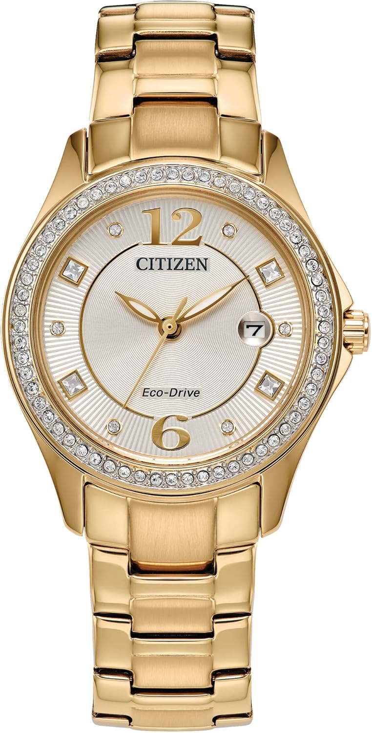 Una declaración brillante se hace con la nueva adición a la colección Crystal. Este elegante reloj brilla con 70 cristales rodeando la caja de acero inoxidable tono oro y el dial champán de 3 manecillas y tiene una pulsera de acero inoxidable tono oro sujeta con un cierre de solapa. Con nuestra tecnología Eco-Drive que es alimentada de manera sostenible por cualquier luz y nunca necesita una batería, este reloj de moda añadirá brillo a tu look de día a noche y una elegancia moderna a tu muñeca.