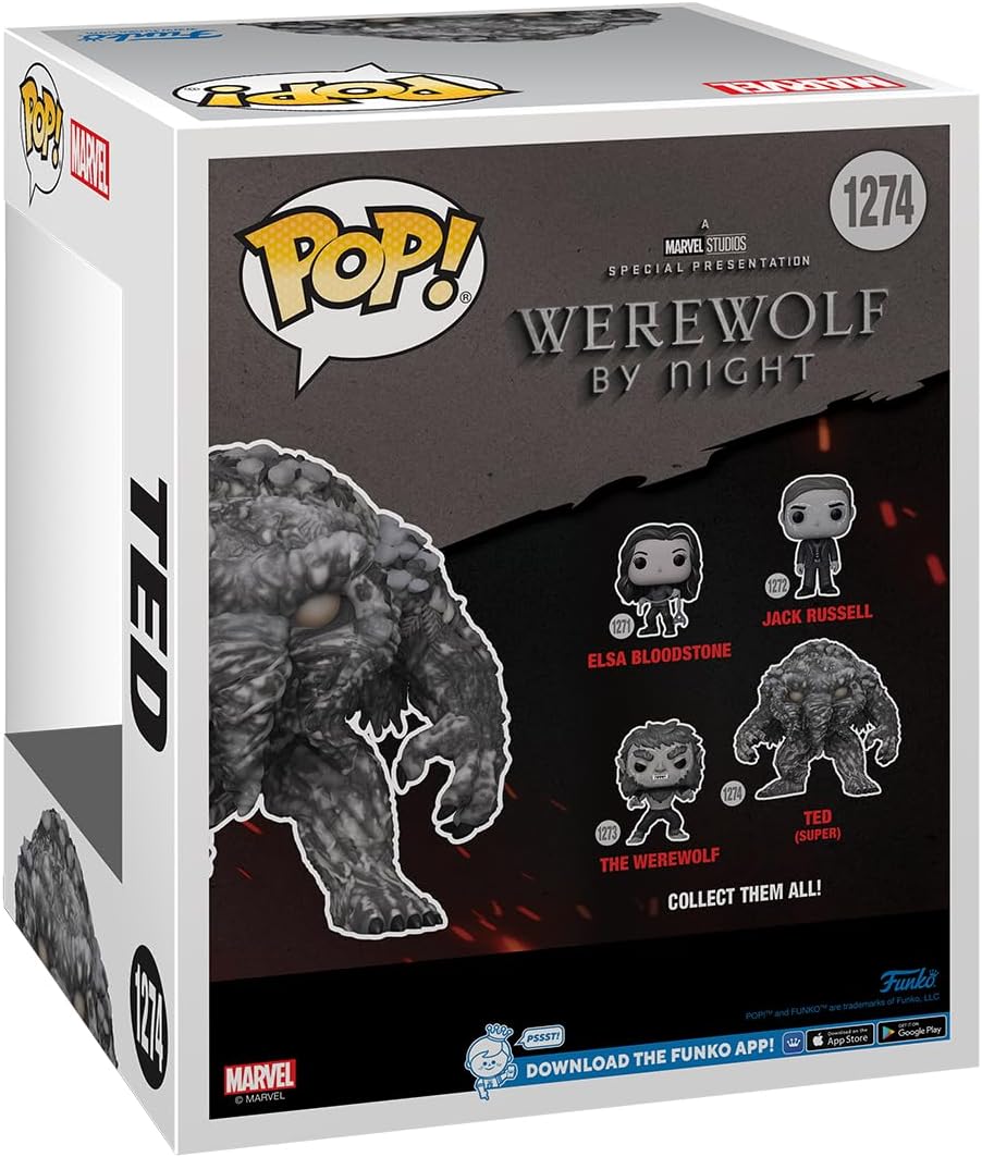 ¡La cacería para ganar el Bloodstone ha comenzado! ¡Regala Super Pop! Ted, un lugar seguro donde esconderse en la colección Werewolf by Night de Marvel Studios. El muñeco de vinilo mide aproximadamente 5.25 pulgadas de alto.