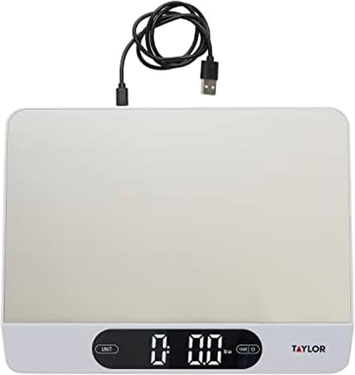 Taylor 22LB High Capacity Kitchen Food Scale with Stainless Steel Surface, Backlit Display, and USB Recharging Cord Included, White