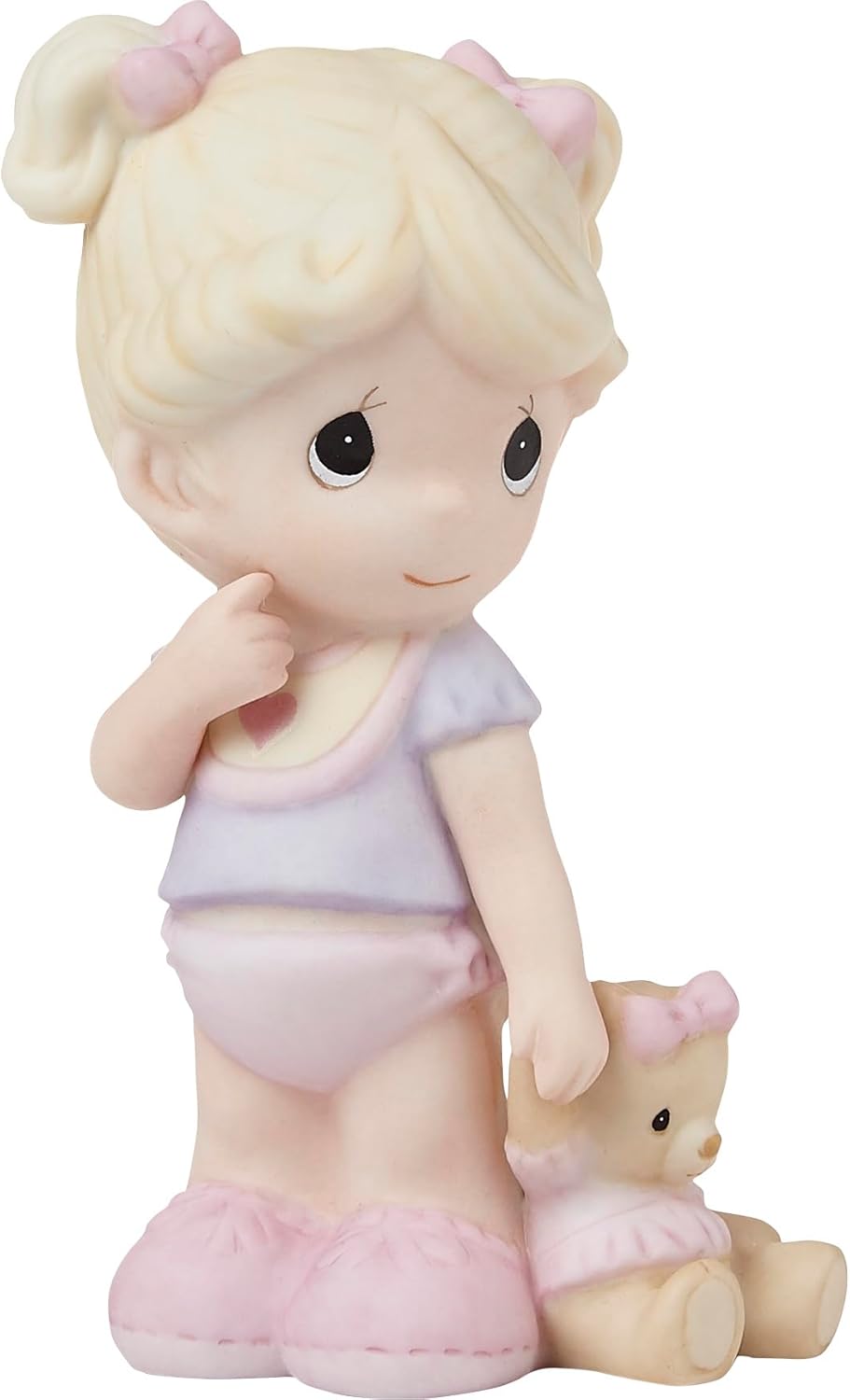 Spending time with a sweet little girl you love will have you feeling tickled pink for sure. With a teddy bear in tow, this pig-tailed toddler shares a special smile. She’s extra adorable in pink and lavender, and you’ll notice a little heart upon her bib. A cheerful accent to nursery room décor, this figurine will be treasured long beyond her first years. Give this darling figurine for any baby girl’s happy occasions – birthdays, holidays, or in celebration of milestones like first steps and first teeth. Measuring approximately 4.25”H, this figurine is meticulously sculpted of bisque porcelain and is expertly hand-painted for an artful gift that shows your thoughtfulness. For more than 40 years, Precious Moments has been devoted to making the world a kinder place by helping people Share The Gift Of LoveSM. A timeless brand, Precious Moments helps you celebrate everyday moments and commemorate special occasions with hand-painted porcelain figurines and ornaments as well as contemporary kitchenware, home décor, baby gifts, and more. A unique inspirational message lies at the heart of every Precious Moments product, thoughtfully designed so you can turn your special moments into memories that last a lifetime